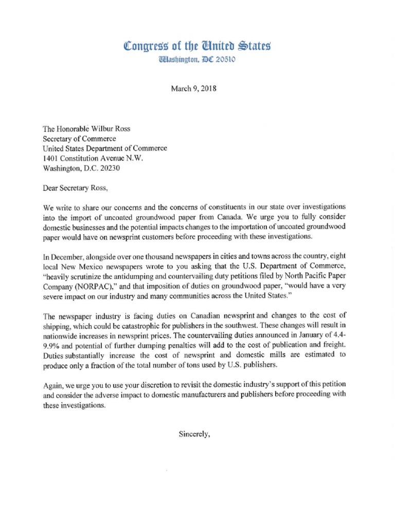 NM Delegation Letter to Sec. Ross on Newsprint Tar...