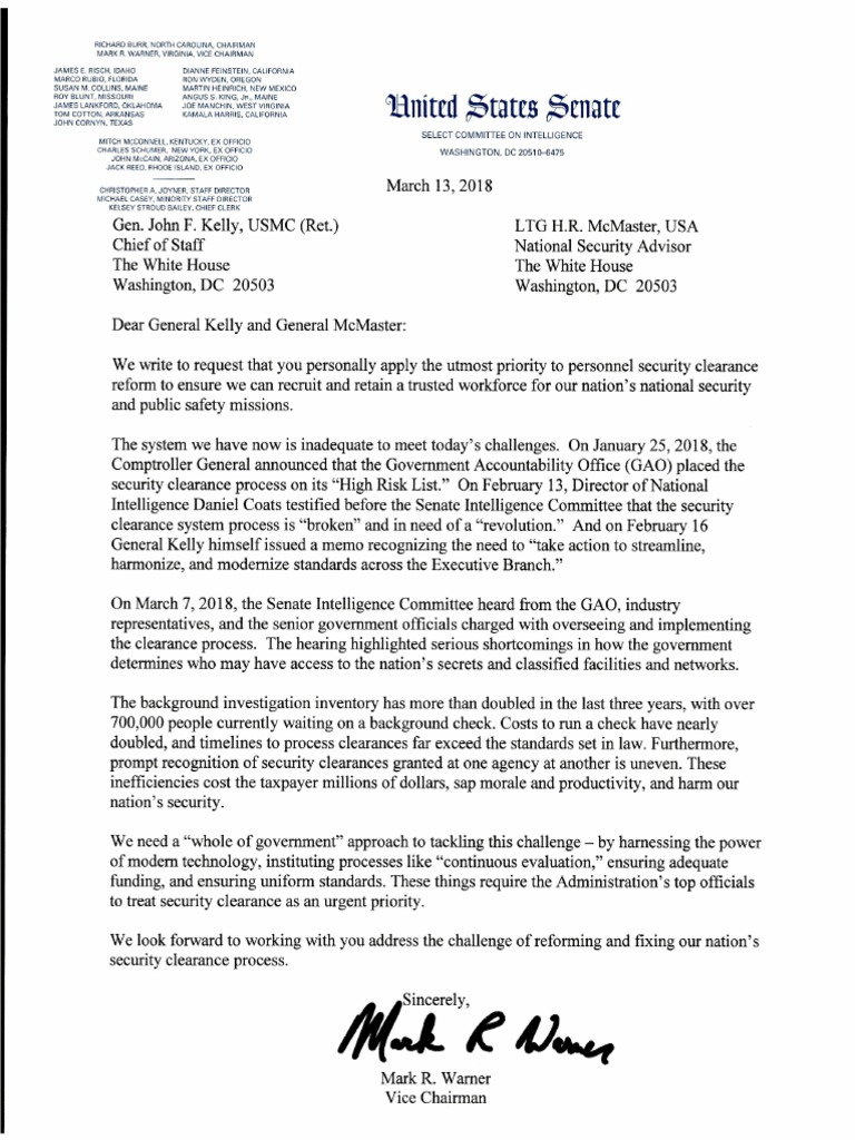 In a letter to the White House, Sen. Warner urged Chief of Staff John Kelly and National Security Advisor H.R. McMaster to “personally apply the utmost priority to personnel security clearan…Description complète