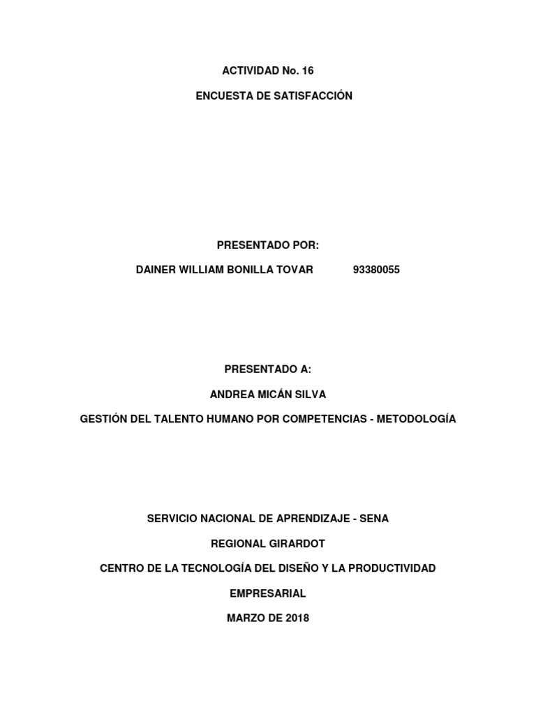Cumplimiento de los objetivos de las capacitaciones.S. ENCUESTA DE SATISFACCIÓN DISTRIBUIDORA LAP S.A. Fecha de realización: 20-marzo-2018 Fecha de revisión: Firma evaluado: Francisco Toro Firma evaluador: Dainer Bonilla . Oportunidad de desarrollo personal y profesional. Congruencia de las actividades y recursos didácticos. Grupo o muestra a aplicar: Área comercial. pero sería bueno ampliar el tiempo destinado para cada uno de ellos. Idoneidad de los capacitadores y del espacio. DATOS DEL EVALUADO Nombres y apellidos: FRANCISCO TORO Cargo actual: ASESOR DE VENTAS JUNIOR DATOS DEL EVALUADOR Nombres y apellidos: DAINER BONILLA Jefe inmediato Supervisor Par Nivel de satisfacción Criterios Nada Poco Muy Satisfecho satisfecho satisfecho satisfecho Pertinencia de los temas de capacitación. PROCESO DE CAPACITACIÓN Y DESARROLLO Identificar el grado de efectividad e idoneidad del proceso de Objetivo: capacitación y desarrollo. Observaciones: Los temas seleccionados son ideales para mejorar el desempeño laboral.