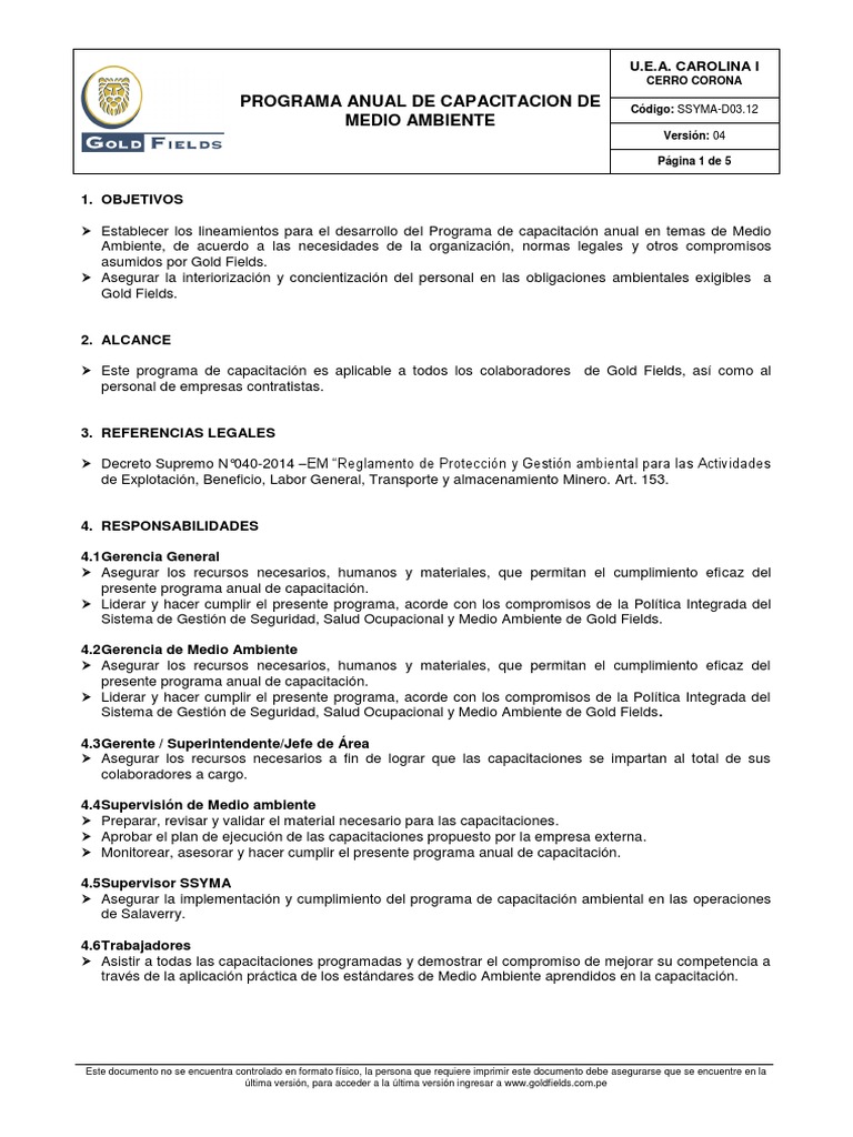 ISO 50001 Sistema de Gestión Energética. Beneficio. U. Labor General. la persona que requiere imprimir este documento debe asegurarse que se encuentre en la última versión.E. 5. para acceder a la última versión ingresar a www. Salud Ocupacional y Medio Ambiente.12-A01) para las operaciones de Cerro Corona. 5. Normatividad sobre Seguridad y Salud Ocupacional (D. el área de Medio ambiente brindará la capacitación requerida. y se ejecutan de manera mensual. Otros. 024-2016-EM). Plan de contingencia en función de los riesgos de cada área o componente. Sistema Integrado de Gestión: Seguridad. 4. Transporte y almacenamiento Minero.2. En Operaciones Salaverry: Primera etapa a cargo del Supervisor SSYMA asignado a las Operaciones Salaverry.pe .03). Los temas a ser desarrollados dentro de la capacitación en Medio Ambiente son: 1. Manejo de Residuos Sólidos. Gestión Ambiental de Cerro Corona. 6. Dentro de esta capacitación se tratan los siguientes temas: Información General de Cerro Corona. Marco Legal Ambiental. CAPACITACIÓN EN MEDIO AMBIENTE El programa de capacitación en medio ambiente.A. CAROLINA I CERRO CORONA PROGRAMA ANUAL DE CAPACITACION DE Código: SSYMA-D03. 3. 5.12 MEDIO AMBIENTE Versión: 04 Página 2 de 5 5. Salud Ocupacional y Medio Ambiente. Objetivos Ambientales. Mientras se contrata los servicios de la empresa externa. Programa de Manejo Ambiental. PROCESO DE CAPACITACIÓN La capacitación en Medio Ambiente se debe realizar en dos sedes: En Cerro Corona: Contratar los servicios de una empresa externa para realizar las capacitaciones incluidas en el anexo Matriz de cursos de Medio Ambiente (SSYMA-D03. Los temas de capacitación que se plantean desarrollar están alineados al Art. está orientada a personal que viene laborando dentro de Cerro Corona y a empresas especializadas que desarrollan labores en los diferentes frentes de Cerro Corona.goldfields. 2. TIPOS DE CAPACITACIÓN Dentro de Gold Fields. Este documento no se encuentra controlado en formato físico. INDUCCIÓN GENERAL Capacitación impartida al personal nuevo de acuerdo a lo definido en el procedimiento Capacitación (SSYMA-P03. se imparten dos tipos de capacitación relacionadas a temas ambientales. Programa de Monitoreo Ambiental. las cuales están orientadas a personal nuevo y personal que ya viene trabajando.S. Política Integrada de Seguridad. Obligaciones Ambientales Específicas.com. 153 del Decreto Supremo N°040-2014 – EM “Reglamento de Protección y Gestión ambiental para las Actividades de Explotación.1.