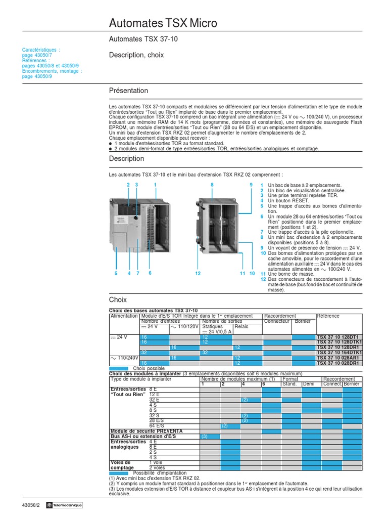 Les automates TSX 37-10 compacts et modulaires se différencient par leur tension d'alimentation et le type de module