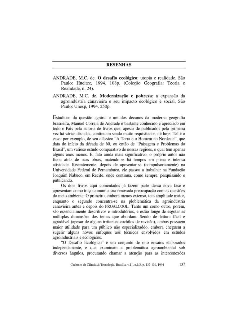 o setor como um todo. e visando a soluções que beneficiem os grupos sociais mais prejudicados pela falta de cuidados com o meio ambiente. Resenhas existentes entre seua aspectos ecológicos. “Modernização e Pobreza” compreende 18 capítulos distribuídos em três partes. para não falar dos governos.1/3. teoricamente. Manuel Correia de Andrade contrapõe-se tanto aos predadores da natureza. tendo resultado. O enfoque é essencialmente intertemporal. Ao lado de textos mais gerais sobre a geopolítica e a ecologia na formação do País. figuram outros mais específicos. novos problemas vão surgindo. Nele constata-se que. Brasília. como aos utópicos. 137-139. os problemas do presente e as conseqüências no futuro. defendendo soluções baseadas no planejamento a longo prazo e na participação ativa de todos os interessados. relativos à agricultura nordestina. reflexão e estudo. e os principais atores que têm interagido no seu 138 Cadernos de Ciência & Tecnologia. que. de vários anos de observação.11. deveriam estar mediando os conflitos entre ambos. cujo desfecho não pode ainda ser previsto. Neles. das águas e dos solos. cuja análise no passado e no presente é objeto do outro livro do autor. tanto do equilíbrio ecológico quanto do tecido social preexistente. mostra que a substituição do latifúndio tradicional pelo latifúndio moderno pode levar e. num capítulo sobre reforma agrária na América Latina. que pretendem conservá-la inalterada a qualquer custo. p. na prática. tem levado a maior depredação. v. mais ambicioso e melhor estruturado que o primeiro. Ele lembra reiteradas vezes que a devastação do meio ambiente envolve não apenas a destruição da flora e da flora. tanto entre os empresários quanto entre os trabalhadores envolvidos. uma das principais vítimas do processo. respectivamente. aos problemas criados pela mineração e à questão da seca. Além da introdução geral e da alentada (mas incompleta) bibliografia. segundo suas próprias palavras. Isto aparece claramente na expansão da agroindústria canavieira. constituindo pelo contrário apenas uma etapa de um processo em curso. n. os espaços açucareiros e alcooleiros da várias regiões do País. econômicos e políticos. sem esquecer seus descendentes e sucessores. à medida que a riqueza vai sendo acumulada e concentrada no setor e à medida que sua tecnologia avança. que estudam. e as relações entre homem e natureza no Brasil de hoje. 1994 . E. e novas implicações abrem perspectivas a novas mudanças. Inclusive porque se trata de um estádio no qual coexistem elementos arcaicos e modernos. a poluição do ar. no seu contexto nacional e internacional. abrangendo as causas do passsado. mas também a degradação do próprio homem. Isto faz com que sua situação atual esteja longe de ser definitiva.