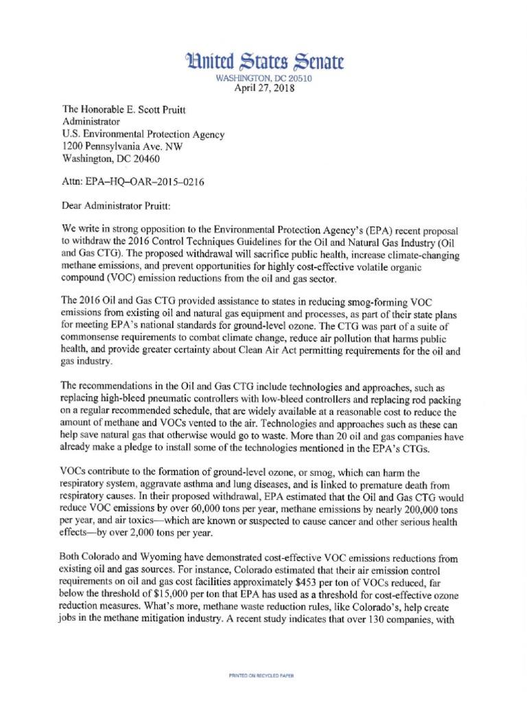 Bennet, Carper Letter to EPA on Pollution Reduction Guidelines for Oil and Natural Gas Industry