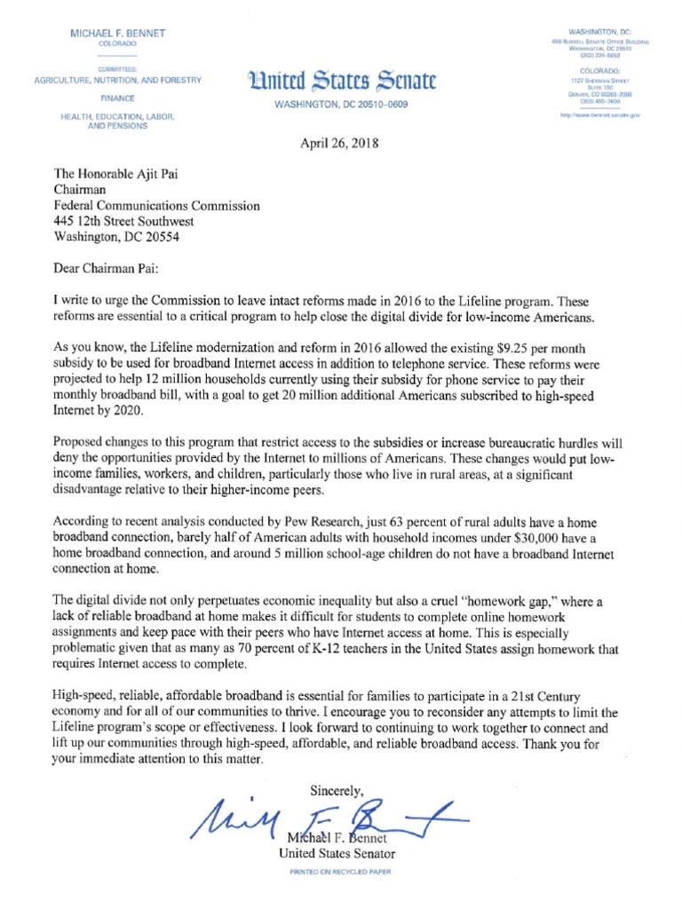 Bennet Urges FCC Not To Undermine Lifeline Broadband Program