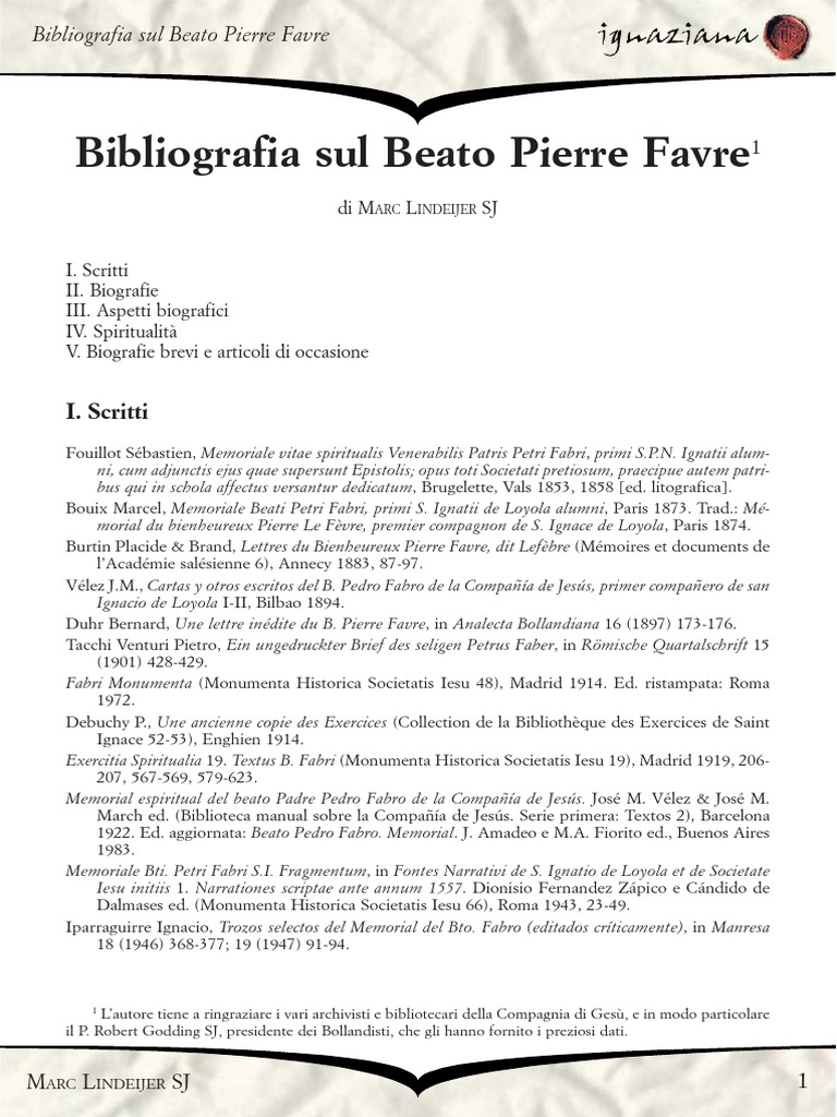 Paris 1892. Biografie brevi e articoli di occasione d’Oultreman Pierre. Tableaux des Personages signalés de la Comp.org) 1 (2006) 54-78. Accueillir le Don: Stimuler la Mis- sion.. 11-29. Madrigal Terrazas Santiago. in Zeitschrift für Katholische Theologie 128 (2006). 119-121. in Revue Savoisienne 13 (1872) 96-97.ignaziana. PP.: Ignace. Impulsar la Misión. in Id.N.org) 2 (2006). Le Bienheureux Pierre Favre ou Lefèvre. François Xavier. Favre. Encouragement to Religious Dialogue: A Letter of Blessed Pierre Favre. in Revue de Spiritualité Ignatienne 37 (2006) no. 31-40. McCoog (ed. Praga 1694. Begheyn Paul.ignaziana. 112.). Torino 1847. 112. Rodríguez Osorio Hermann. in Estudios Eclesiásticos 82 (2007). Xavier. El itinerario místico de Pedro Fabro. Fabro. Patrignani Giuseppe Antonio. in Ignaziana (www. 28-43. Dall’anno 1538 fino all’anno 1728. – Ignatius. Ite Inflammate Omnia. reforma y misión. Pedro Fabro (1506-1546). Studies in the Spirituality of Jesuits 38/1 (2006-1). Ignacio. Eclesialidad. Zas Friz Rossano. Madrigral Terrazas Santiago. Urging the Mission. in Religious Life Re- view 48 (2009) 133-142. Ducis Abbé. II. Favre and Our Way of Proceeding. O’Leary Brian. Pierre Favre as director of the Spiritual Exercises: The case of Peter Canisius. Zollner Hans. 11-29. Tanner Mathias. in Stimmen aus Maria-Laach 3 (1872) 288-307. Pierre Favre als begeleider van de Geestelijke Oefeningen. 40-45. Der selige Petrus Faber aus der Gesellschaft Jesu. 253-267.. V. Menologio di pie memorie d’alcuni Religiosi della Compagnia di Gesù. de Guilhermy Élesban. Madrid 2008. 112. 235-276. El legado teológico de Ignacio de Loyola. Het voorbeeld van Petrus Canisius. 11-31.ie de Jesus exposés en la solennité de la Canonization des SS. Javier. Rodríguez Osorio Hermann. Peter Favre. Peregrinación interior de Pedro Fabro. Discernimiento y obediencia en Pedro Fabro . Pedro Fabro ante la Reforma Protestante. 249. Pedro Fabro y Francisco de Javier. 131-158. O’Leary Brian. Selected historical papers from conferences held at Loyo- la and Rome in 2006. Cornely Rudolf. Ménologe de la Compagnie de Jésus: Assistance de France vol. Ignace et Francois Xavier. Bibliografia sul Beato Pierre Favre N. 71-78. Acoger el Don. in Theologica Xaveriana 56 (2006) no. 146-167. 277-307. III. Bartoli Daniello. in Ignaziana (www. In Their Own Words: Ignatius. 1 agosto. 53-65. Trad. Xavier: Welco- ming the Gift. in Review of Ignatian Spirituality 37 (2006) no. 8 MARC LINDEIJER SJ . Degli uomini e de’ fatti della Compagnia di Gesù memorie istoriche I. in Revista de Espiritualidad Ignaciana 37 (2006) no. 160. Douay 1623. in Estudios Eclesiásticos 82 (2007). García de Castro José. Societas Jesu Apostolorum Imitatrix. Schineller Peter. “Él es lo primero y principal”. 71-84. Inspirador y constructor de la primera Compañía de Jesús. Roma 2010. Faber. vol. Das werden eines Zeugen: Die Psychologie des Selbst und das Glaubenszeugnis des Peter Faber SJ. in Cardoner 26 (2007). Begheyn Paul. 641-664. in Religious Life Review 47 (2008) no. in: Thomas M. The Jesuit and the Carthusian: Tale of an Intriguing Friendship. Venezia 1730.