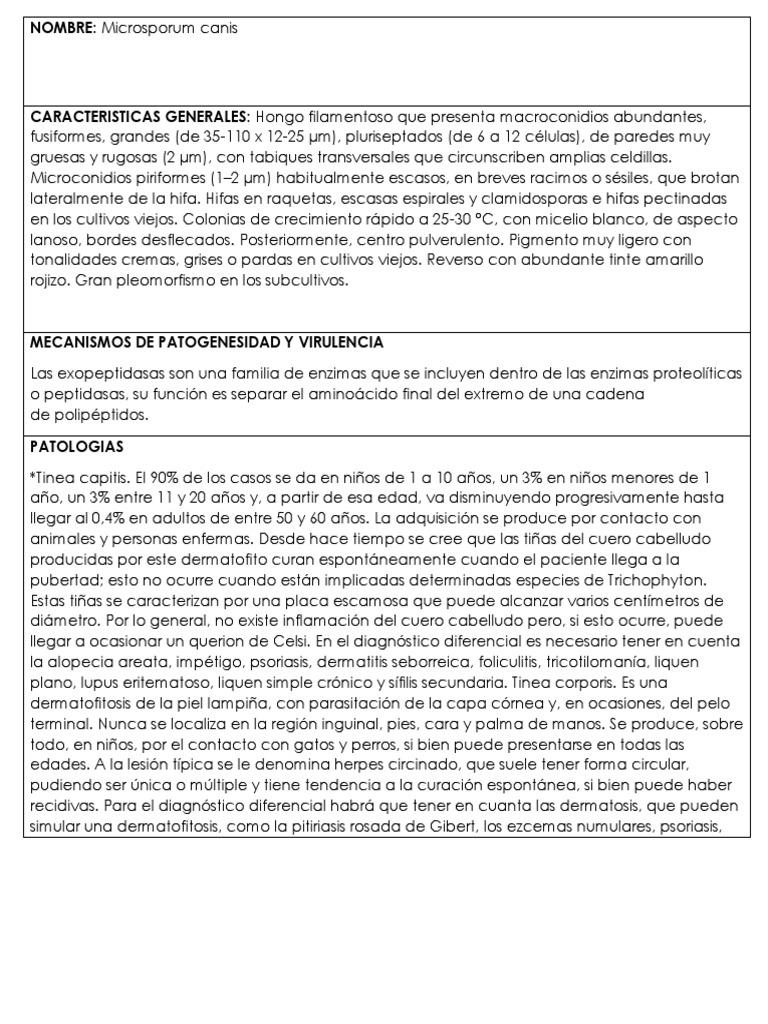 Humidificación con suero fisiológico. Provoca tinea capitis y tinea corporis. EPIDEMIOLOGIA Hongo de distribución mundial.Itraconazol 3-5mg/kg/día x 4-6 semanas . Otras medidas terapéuticas complemento del tratamiento sistémico: . principalmente en niños. En los pacientes con sida las lesiones pueden ser extensas. Raramente causa de onicomicosis.Lavado diario con azoles. . perros y monos (llega a alcanzar proporciones epizoóticas). .62. mientras que puede ser invasor de la dermis en personas en tratamiento inmunosupresor.Depilación de los cabellos de la zona afectada.Fluconazol 6mg/kg/día x 20 días u 8mg/kg de 8-16 semanas. sulfuro de selenio. Cuando se transmite al ser humano es una especie muy contagiosa que da lugar a brotes epidémicos familiares o escolares. Causa de tiña en gatos. . piritionato de zinc todos en champú.125mg/día ( 20-40 kg) ..5mg/día (10-20 kg) durante 2-6 semanas Tratamiento alternativo: . Produce un ectothrix con células pequeñas y fluorescencia con la lampara de Wood de escaso valor diagnóstico. Puede ser también un colonizador del pelaje de los animales pero sin causar sintomatología (ampliamente distribuido entre animales domésticos).