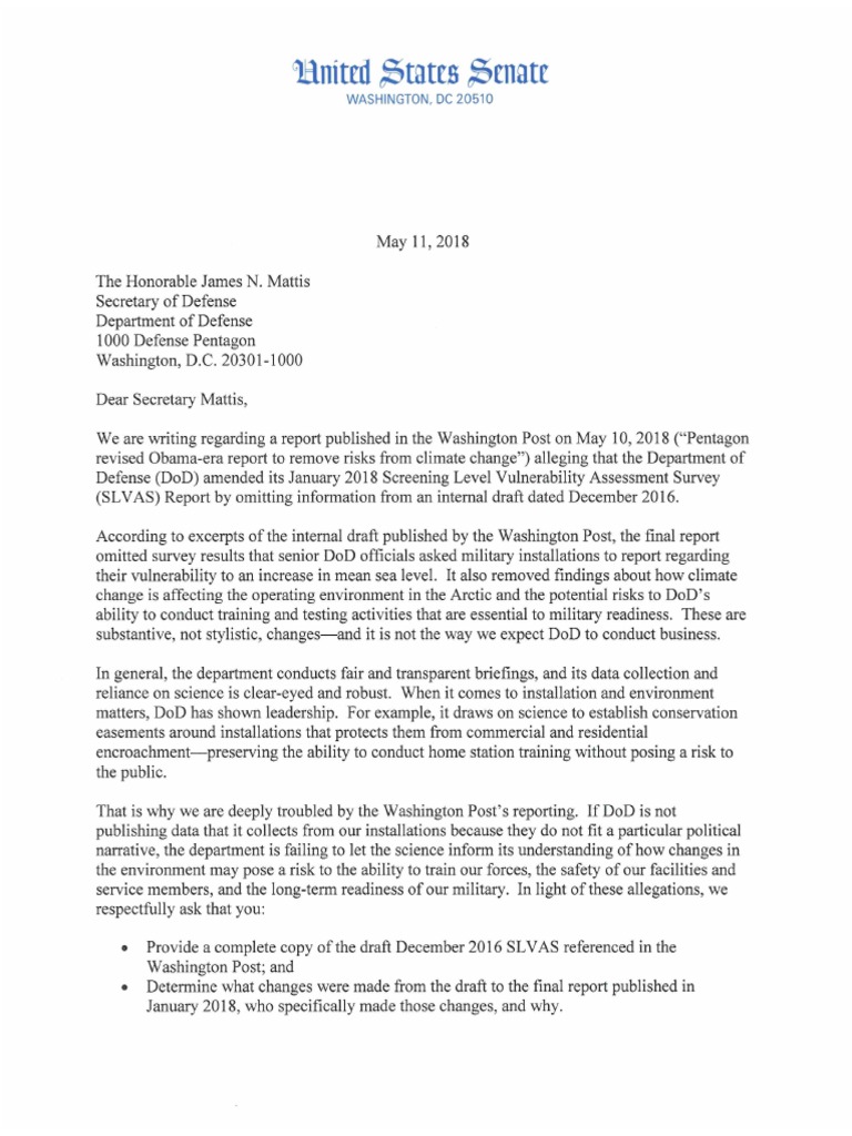 Following a report that the Department of Defense (DoD) revised a January 2018 vulnerability assessment by removing references to climate change and key findings on the risks from sea level …Description complète