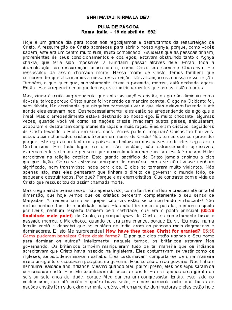 Eles são sempre agressivos. 2 Páscoa – 1992. o que ele organizou estava cheio de ego. Mas. tem tais palavras que fazem com que as pessoas começem a pensar que não há limites para elas.04. um por um. Eles pensam que não há limite para eles mesmos. A primeira delas. que eles usam agora como autoridade. primeiramente. Não apenas os europeus fizeram isso. ele negou. E o colocou sobre uma pedra e ele daria início a Igreja. nós temos que observar a história do Cristianismo. o controlou e o aceitou em sua própria confiança e disse a Pedro: “se você se aliar a mim. Isso foi apenas a manipulação e o controle de tudo. Cristo deve ter mencionado sobre a Kundalini. Pedro era uma pessoa muito egoísta e. também nós temos. Este homem sinistro. Mas. ele cortou muitas coisas que deveriam estar lá. Sem dúvida. que era a sabedoria. editou a Bíblia. E alguns deles são muito fracos. Cristo tenha dito que você tem que nascer de novo e todas essas coisas sobre as quais Mateus insistiu. Tudo isso. Mas. foi feito com seu intelecto burocrático. havia Pedro. 13:10 uma blasfêmia. Este ego sutil. Mas. anti-Cristo. a fonte da sabedoria. Todo o trabalho de Cristo foi parar nas mãos desse demônio. mostrando sua facetas. Ele as evitou. Eu estou certa disso. Pedro envolveu-se em seu próprio ego. com grande luta. ele combateu Mateus e não conseguia aceitar a Imaculada Concepção. nos países democráticos. Eu pediria ao homem mais fraco para fazer tal coisa? Eu nomearia uma única pessoa para cuidar de tudo? Essa parte da Bíblia é. sobre os milagres que existem com a Divindade. achando que não havia limite para si mesmo. esse demônio entrou na disputa de uma grande religião como o Cristianismo e tudo virou de cabeça para baixo. E quando ele editou. E foi dessa forma que. sem dúvida. que fosse satânico e que fosse. Depois Paulo disse a todos os outros discípulos: “vocês não são tão instruídos. sugere que se vocês se tornarem membros de uma igreja. na Sahaja Yoga. se você ler o que ele escreveu. existem estes tipos de Sahaja Yogis que estão. Eles não conseguem continuar com ninguém. então não deveríamos escrever todas as coisas que vocês têm escrito. porque ele era um discípulo muito fraco de Cristo. foram embora. Ele iniciou o seu próprio estilo. Sendo Paulo um grande burocrata. Esta foi a época em que Paulo surgiu e ele pensou que era uma boa oportunidade de controlar alguém que fosse uma pessoa fraca. eu farei de você a pessoa mais importante”. e o fato de Seus discípulos serem tão estúpidos e idiotas não pode ser explicado! Por que aconteceu assim? Então. Mateus ainda manteve o seu próprio evangelho. na verdade. eles conseguiram preservar certas coisas em seu sentido original. Então. agora. vocês são os escolhidos. Imaginem. E é desta forma que a Bíblia. vocês deveriam cortá-las”. Como Paulo não tinha nenhuma idéia sobre a Verdade. Cristo disse: “Você é Satã.19 .Roma . Eles irão gritar com as pessoas. pois está cheio de ego. Paulo viu que deveria estar escrito que Pedro fundaria essa igreja e que ele teria a chave e que Cristo disse isso. embora. Mas. sobre a realidade. ele o envolveu. que uma vez foi uma qualidade inerente 07:23 aos monarcas. a tal ponto que eles são idiotas. cujos seguidores são chamados de gnósticos. Eles não conseguem ser coletivos. João fugiu. Como vocês sabem.” Ele disse claramente e também disse: “Você Me negará três vezes”. doze tipos de Sahaja Yogis. E Ele encontrou Pedro. Ele começou a editá-la. com exceção de Tomás. Mas. Então. Eles nunca demonstram amor pelos outros. Impossível! Coloquem-Me no lugar de Cristo. Então ele editou o evangelho de Lucas e o de Mateus e. extremamente egoístas. tem se tornado disponível a todas as pessoas comuns e todos esses países estão cheios de destruição. eles seguem Cristo. você se surpreenderá. certa vez. então. eu sou um homem muito instruído e sei o que escrever e o que não escrever. de algum modo. Mas Paulo não mencionou nem uma palavra sobre todas essas coisas. mas mesmo os americanos são extremamente dominadores. São fracos porque têm muito ego. Mas. Pedro atuou nisso.no comando dos negócios. Eles perturbam os outros. Os outros discípulos. Ele editou a Bíblia. Como vocês sabem. o que quer que ele escreveu. uma vez que ele tenha dito isso na Bíblia. Paulo.