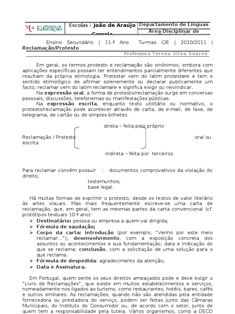 protesto/reclamação pode acontecer através de carta, de e-mail, de faxe, de