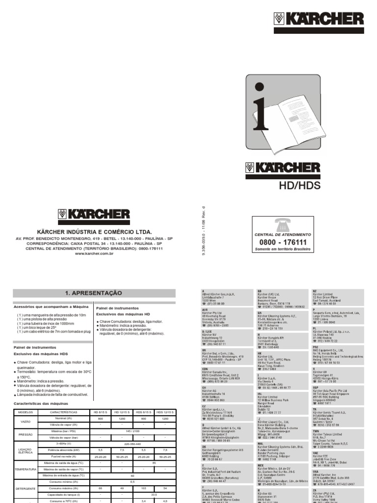 AV. PROF. BENEDICTO MONTENEGRO, 419 - BETEL - 13.140-000 - PAULÍNIA - SP CORRESPONDÊNCIA: CAIXA POSTAL 34 - 13.140-000 - PAULÍNIA - SP CENTRAL DE ATENDIMENTO (TERRITÓRIO BRASILEIRO): 0800-176111 www.karcher.com.br