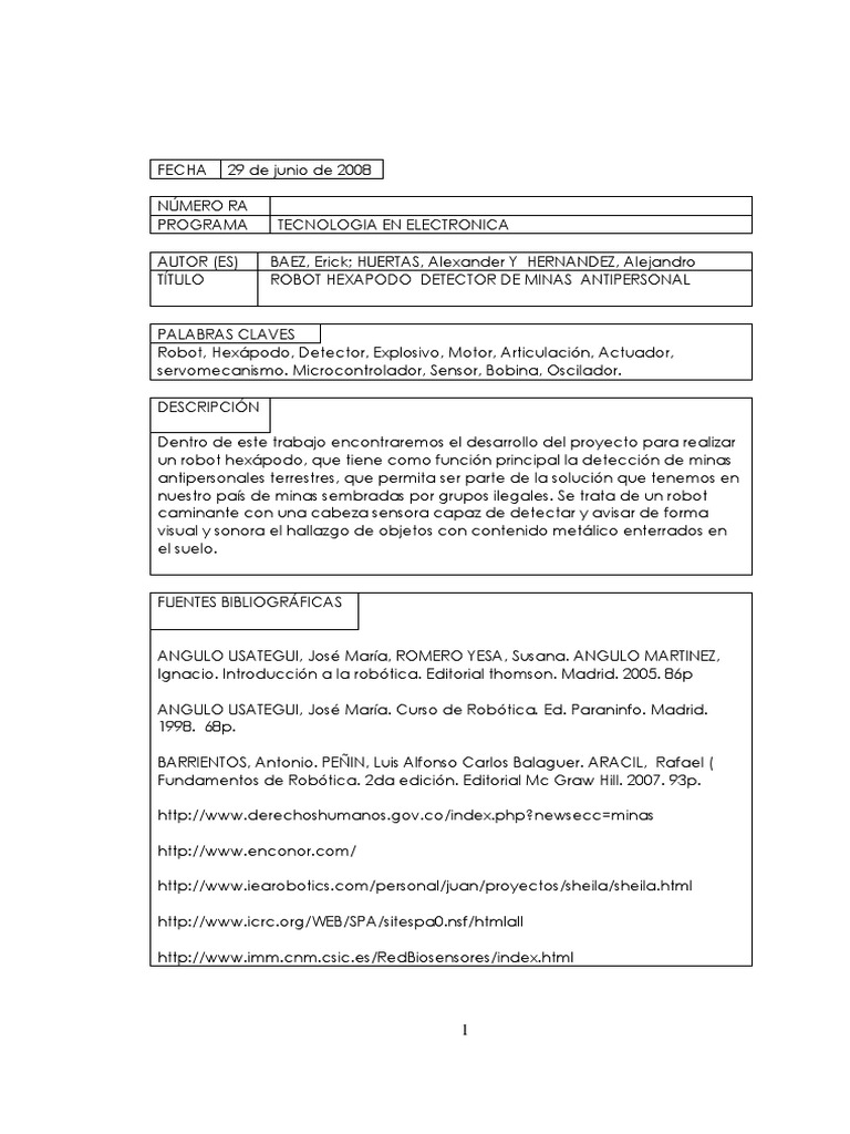 ROBOT HEXAPODO DETECTOR DE MINAS ANTIPERSONAL ERICK ALEXANDER BAEZ RODRIGUEZ ALEXANDER HUERTAS GUAQUETA NORMAN ALEJANDRO HERNANDEZ PROYECTO DE GRADO PARA OPTAR AL TITULO DE TECNOLOGO EN ELECTRONICA ASESOR NESTOR PENAGOS INGENIERO ELECTRONICO UNIVERSIDAD DE SAN BUENAVENTURA TECNOLOGIA EN ELECTRONICA PROYECTO DE GRADO BOGOTA D.C 2O08 6 .