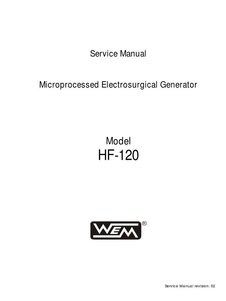 Service Manual revision 2 Added sections 2. The purpose of this manual is to provide information about the application and the installation of HF-120. and subsections 2. for use of the single and the double footswitch.Service Manual HF-120 General Information 1. Contents of this manual may not be reproduced in any form without the written permission of WEM Equipamentos Eletrônicos Ltda. chapter 6 and Appendix A. read the Operational Manual of HF-120 carefully for a thorough understanding of operation and principles of electrosurgery.8. such as technical information to maintenance and calibration.5. 2.5. WEM will not be responsible for an improper use of the information contained here.1 .5. ⇒ ATTENTION: Before to start the maintenance.3.1.1 – INTRODUCTION The following service instructions are for use only by qualified personnel to installation and maintenance of the electrosurgical unit described in this manual.2 and 2.7 and 2. Page 1. All rights reserved. besides reorganization in this manual in relation to the previous one. Note: Take a look on section “Version of the Software”. WEM reserves the right to make changes in this manual or in the equipment without advance notice.