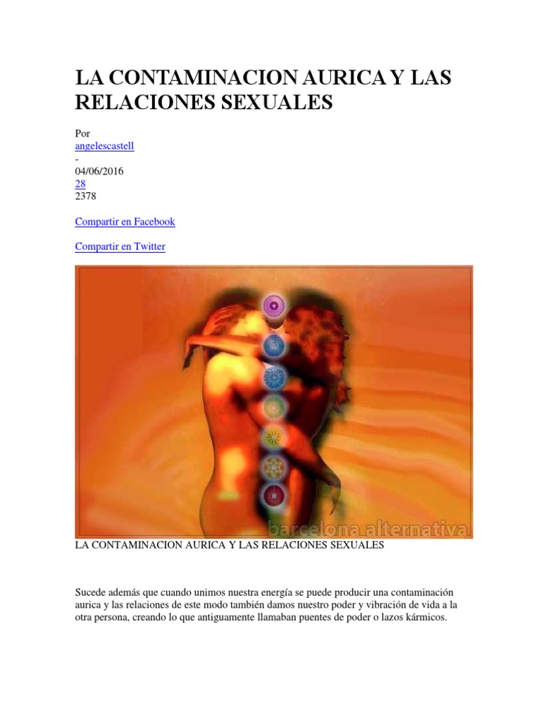 “adulterando” la energía creada en su relación estable. Si bien la unión energética hace que la energía del otro se mezcle con la de nuestra aura. hasta el punto que podemos llegar a enfermarnos. Si estás con una persona que no le hace ninguna limpieza interna a su ser. Esto explica las relaciones adictivas (según el chakra con mayores cordones). aun cuando la relación haya terminado. también durante la unión se forman lazos o cordones a través de los chakras. dentro del cual se tienen relaciones. tiene relaciones con varias parejas muy densas y contagiadas con energías de otros. También te interesara: ¿Qué es la terapia craneosacral ? Si una mujer queda embarazada en este tipo de vínculo. Tales cordones también son perdurables y sirven de puente para la constante comunicación energética. sino que también se toma parte de las energías de las demás personas que intimaron con ella. nos enviará buenos pensamientos y energías. los apegos y las dificultades que se tienen para romper definitivamente con relaciones no sanas.Los líquidos seminales y vaginales se convierten en plasmas energéticos dentro de los cuerpos sutiles y por ello el lazo no se rompe fácilmente. creando lo que se denomina un nido de larvas. recibiremos por medio del hilo malos pensamientos. y los casados o comprometidos infieles contaminan a sus parejas al traer toda esa basura energética a su vínculo conyugal. al fusionarse una con otra. lo que tiene repercusiones en su calidad como ser humano. Si tenemos un lazo con alguien que nos quiere. Las cosas se complican cuando la cadena es grande. Los lazos energéticos tienen un aspecto positivo y un aspecto negativo. obstáculos y malas energías. bloqueos. o está apegada y obsesionada. Al mismo tiempo. el ser que encarna viene del más bajo astral o muy impregnado con cargas densas. o ambas. . Esta unión energética dura siete años a partir de la ultima relación. no sólo se adquiere parte de su carga energética. ha estado con muchas otras y tampoco ha limpiado lo que las demás han dejado en ella. nuestro espacio y nuestro cuerpo físico y energético. esto obstaculiza la formación de una mejor relación de pareja. Si la persona no nos quiere y está pensando mal sobre nosotros. El nido energético Ocurre también que una de los dos personas. Es así como seguimos unidos con todo aquel con quien hemos compartido nuestra cama.