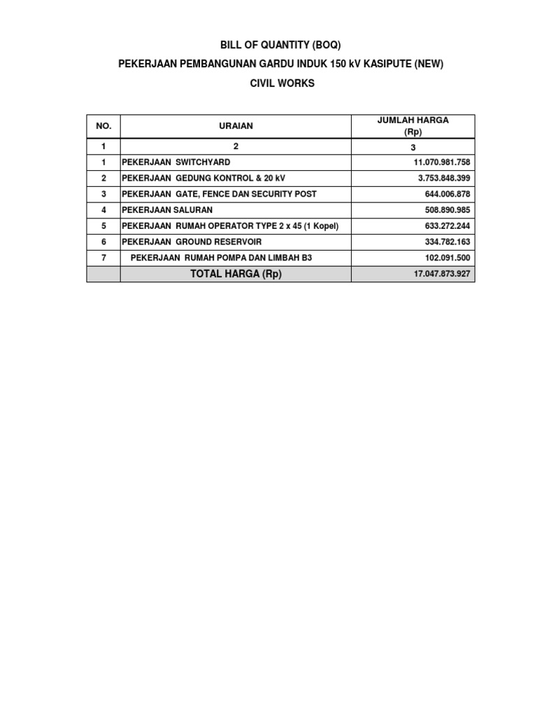 635.000 125.BRC 1.056 3 I.Tanaman Penutup Tanah 50.00 pohon 3.40 m height (lower part) and wire mesh 0.000 6 Landscaping ( tanaman termasuk tanah. Kansteen beton pada switchyard (15x30x50cm) 307.218 b.056 B SITE WORK 1 Pekerjaan Tanah a.00 Ls 50. Urugan Kembali dan perataan 6.000 .734.721 18.00 ls 60.000 375.DP Type 2.169.00 unit 35. Base structure m3 c.783.000 9 As Built Drawing 1. URAIAN PEKERJAAN VOLUME SAT SATUAN (Rp) JUMLAH A PREPARATION WORK 1 Pagar Sementara dari Seng Gelombang Tinggi 2.000.000 35.596 c.250.000.84 m2 128.00 Ls 25.648 127.000 25.500.5 meter m' .DP Type 4.448.Core Drilling (Boring) 5.20 m height .DP Type 2 meter m' .00 ls 10.00 unit 21.031 f.000.950 b.DP Type 5 meter m' e.73 m' 199.572.500.500.000.00 m 471. perawatan) .000 1.000.623.000 10.3 m width 6.250.9 m width unit 25.000.00 m2 100.00 ls 24.000.86 m' 119.000 500.000.475. Bouwplank 471.819 158.144. t= 15 cm m3 4 Fence complete with barbed wire.000 TOTAL A 881.275 110.465 m2 45.000 75. 50 mm Asphalt penetration 135.51 m' 5.624 8 Rabat beton 1:3:5. Dinding Penahan Tanah Pasangan Batu 1: 4 1.000 10.391.702 (upper part) (type 1) 5 Gate complete with pole.152 .169.537.962 .026 17.00 ls 10.000 .080.000 .374.25 m3 311.964 b.Fence Brick Wall 2. t= 5 cm 3. m' .000.90 m height. pupuk.000 277.000 206.000 8 Listrik Kerja 1.00 m' 3.53 m2 15. Urugan Pasir t=5 cm .107.00 pohon 25. t= 5 cm m2 d.000.Pekerjaan Jalan Aspal: a.84 m2 82.000. penanaman.625 347.120 d.542 1.37 3 45.000.00 Titik 7.175 1.00 pohon 50.000 . Prepare compacted subgrade m2 b.Sliding BRC gate 1.Rumput 150.5 meter m' .000.000.20 m height.528 . Test Sand Cone 50.00 ttk 7.000.84 m2 136.000 24. Soil Disposal .886 .000 4 Site storage ( 4 m x 15 m ) 1.000 1. 3.000 .000 60. Prepare compacted subgrade 135.accessories and foundation .781.Tanaman Pagar 50.60 m height 1.037 84.804 663.DP Type 3 meter 166. m3 2 Kansteen: a. 50 mm Asphalt hot mix 135.800 307.000 15.390 d.000.500.DP Type 3.067 10. 1 BILL OF QUANTITY (BOQ) PEKERJAAN SWITCHYARD PEKERJAAN PEMBANGUNAN GARDU INDUK 150 kV KASIPUTE (NEW) HARGA NO.067 11.000 7 Hamparan Batu Pecah 3.000 6 Penyediaan Air Kerja 1.270.Tanaman Perdu 10.Pohon Besar / Tanaman Peneduh 5.330.DP Type4 meter m' .000 50.000 17.444.DP Type 1.000 .20 m' 199.000 7 Mobilisasi & Demobilisasi Peralatan 1. Paving Blok K-400 m2 b.38 m2 496.715.688 392.000 5 Soil investigation .90 m height (Type 3) 120. Site Clearing 13.033 II.86 m' 831.719.000 3 Site office ( 4m x 6 m ) 1.950. accessories and foundation .000.000 g.037 61.000.00 ls 10.00 ls 100.000 100.000.629 56.Double BRC gate 1.DP Type 1 meter m' .000.859 c.229 .5 meter m' .97 m3 993.000.BRC 1. Galian Tanah dengan alat berat 6.722.20 m height.621. Rabat beton 1:3:5.147.00 pohon 25.122.322.57 m' 916. m3 lll.00 Titik 25.37 m3 175. 6. Beton bertulang K-225 .611.3 m width 1.997.5 meter m' .125 336.Single BRC gate 1.000 . Base structure 20.Dutch Cone Penetration Test (sondir) 10.465 m2 88.Pengujian Laboratorium (Job Mix Formula) dan Laporan 1. Timbunan Tanah dan Pemadatan/perataan (tanah dari luar) (per 30 cm) 1. Kansteen beton pada jalan (20x30x50cm) 424.444.650 m h.000. 0. Pekerjaan Jalan Beton: a. Pekerjaan Jalan Paving Blok K-400: a.082.000 10.000.056 2 Perlengkapan K3 1.000.