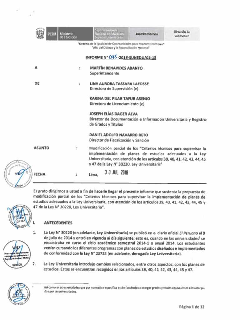 RECOMENDACIÓN 36. acorde con lo propuesto en el presente informe. para los fines que estime convenientes. 38. con atención de los artículos 39.42. Comunicar a las universidades licenciadas y a aquellas que se encuentran en proceso de licenciamiento. Modificar los “Criterios técnicos para supervisar la implementación de planes de estudios adecuados a la Ley Universitaria. sobre la modificación que se disponga a los mencionados criterios. Atentamente.41 y 42 de la Ley Universitaria con la fecha de publicación en el diario oficial El Peruano de la licencia institucional.43. 44. 45 y 47 de la Ley N° 30220. 40. Es todo cuanto tenemos que informar. 41. Ley Universitaria”. LINA AASSARAFOS5E DANIEU NAVARRO R. /ÚIREcTORA (e) DIRECTOR DØEcCIÓN DE SUPERVISIÓN DIPECC”i’ :1 FISCALlZACtÓNY0l Supinl4ndenci0 Nacional de (uperintendencia Nacional de EducaCIónISUPOfbr Universitaria Educación Superior universitaria —a KARINA DEI PILAR TAFURASENJO Clrecoçalei SER ALVA Dsecoo de LwiQam’elo Supenotendenca Nacional de IRECTOR Educación Superior Unrwersnaria Dhoccj6n d Documentación e Información Universitaria y Registro de Grados y TIbiOS Superintendencia Nacional de ducadón Superior Universitaria Sunedu - Página 12 de 12 . Superbtendencia Dirección de Ministerio Nacional dejducación Superintendencia Supervislon de Educación Superior Unrvemtana ‘Decenio de la Igualdad de Oportunidades para mujeres y hombres’ “Aflo del Diálogo y la Reconciliación Nacional” implementación de los planes de estudios de pregrado adecuados a los artículos 39. aprobados por Resolución del Consejo Directivo N° 006-2018-SUNEDU/CD. Derivar copia del presente informe a la Oficina de Asesoría Jurídica de la Sunedu para su conocimiento. IV. 37.