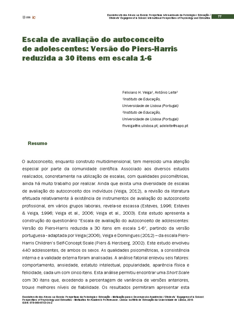 Despite the diversity of scales for the assessment of individuals’ self-concept (Veiga. Veiga et al.. This analysis resulted in a 30-items short scale. podendo ser utilizada nas investigações educacionais. physical appearance and happiness. teachers and other education professionals. com utilidade para psicólogos. 2003). which exceeded the variance percentage of the original total scale. . by psychologists. 2012) of Piers-Harris Children’s Self-Concept Scale (Piers & Herzberg. 2012). from the Portuguese version (Veiga & Domingues. with five items each. The present study aims to describe the development of the “Adolescents’ Self-concept Short Scale” (ASCSS). 2006. specifically with adolescents and youngsters. adolescents. popularity. validação. showing. escala de avaliação. Factorial analysis allowed finding six factors: behaviour.78 Feliciano H. particularly concerning the use of scales and their psychometric characteristics. nomeadamente no estudo do autoconceito em adolescentes e jovens. evaluation-scales. plenty work remains to be done. as a multidimensional concept. Abstract Self-concept. validation. has received special attention from the scientific community. Psychometric qualities. intellectual status. This study comprised 440 adolescents. 1996. professores e outros profissionais de educação. Key words: Self-concept. 2002) PHSCS. Palavras-chave: autoconceito. therefore. However. Results indicated a short scale with psychometric qualities that may be used in educational research. adolescentes.. the literature review on the existing instruments for the assessment of professional self-concept in several labour groups is still limited (Esteves. Veiga et al. of both sexes. Veiga e António Leite Short Scale com qualidades psicométricas. 1996. internal consistency and external validity were analysed. 2012). specifically in adolescents and youngsters (Veiga. better levels of reliability. Esteves & Veiga. Esta escala pode constituir um novo instrumento de trabalho. anxiety.