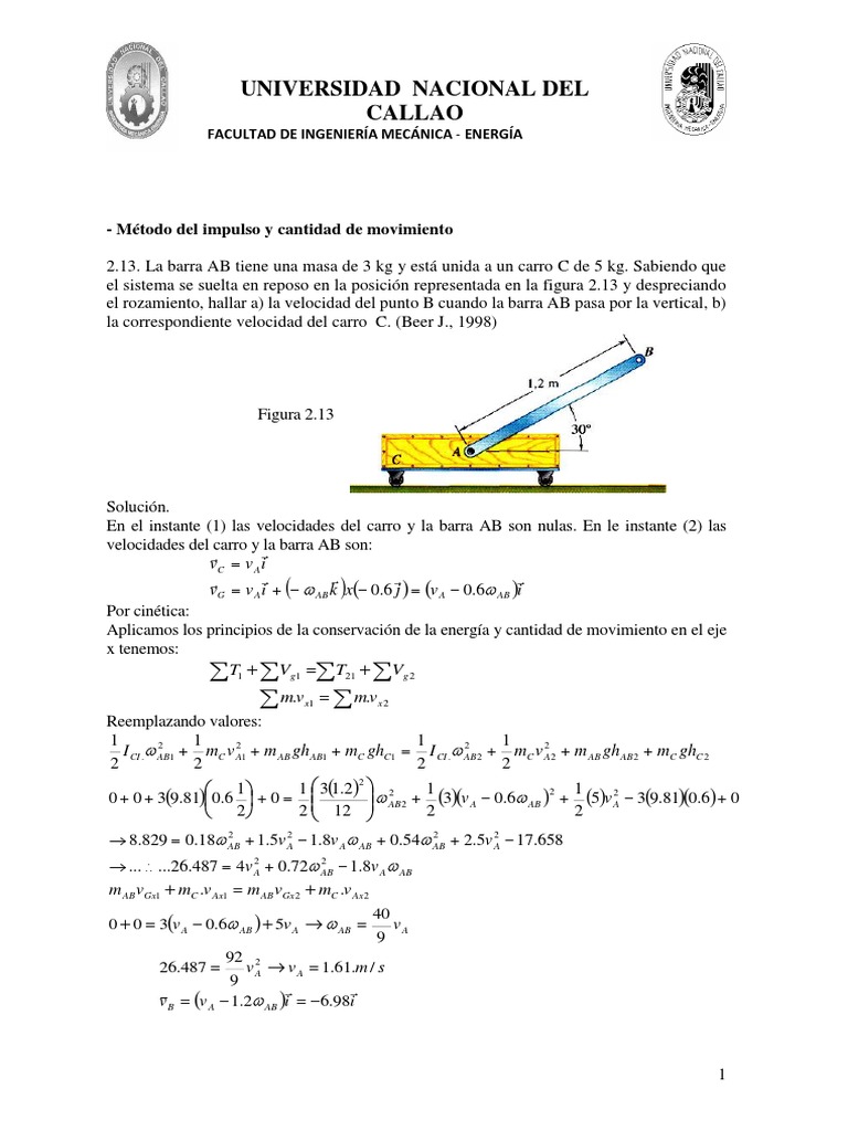 741 AB 2 CD 2 CD 2 8..44527. y. Las barras AB y HD se trasladan sobre una superficie horizontal sin rozamiento...176 0 0.4452 AB 2 0.3818.2331 cos m m 104. (Shames. ¿Cuál será la velocidad angular post impacto de AB?.176 3.K 2 vCD ...6 2.K 1 v AB...3811 cos m 1 2 2 6.100i vC1 fx i vC1 fy 0..1 HDf j 4 .810....195 0..ENERGÍA I B AB1 I C CD1 I B AB 2 I C CD 2 0. La barra HD pesa 70 N y la barra AB pesa 40 N.K 1 0 0... Se descompone las velocidades en dirección tangencial y normal a la línea de choque GB en los instantes inicial (i) y final (f). T2 Vg 2 T3 Vg 3 1... 1999).. 5...552 5. HDi 0 vC1 f vC1 fx i vC1 fy j vG1 f vC1 f HDf xrG / C1 vC1 fx i vC1 fy j HDf k x0.271CD 2 AB 2 2. UNIVERSIDAD NACIONAL DEL CALLAO FACULTAD DE INGENIERÍA MECÁNICA .7...17 Solución: Análisis de las velocidades de las barras HD y AB en los centroides C1 y C2 y puntos de choque G y B..03 0 0 1.662CD 2 e 0.rad / s ..8 vCD...... Figura 2..17.6627.662 AB 2 0.03. .49.rad / s Después del choque: Hay conservación de la energía de la barra CD entre las posiciones (2) y (3). Cuando éstas chocan en el punto G tenemos un coeficiente de restitución de 0.K 2 0.271CD 2 v AB.4452 AB 2 0.40...289... vC1i vGi 20 j .