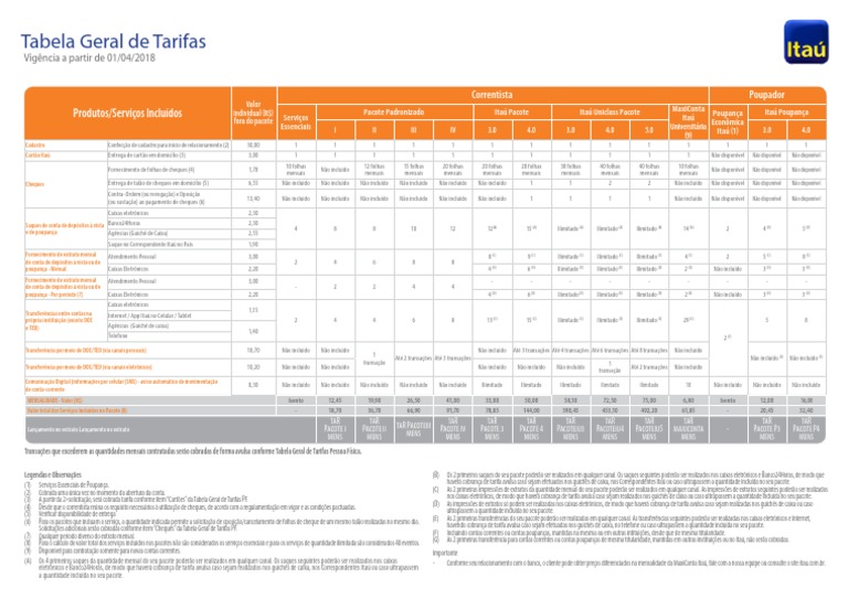 (1) Serviços Essenciais de Poupança. haverá cobrança de tarifa avulsa caso sejam efetuados nos guichês de caixa, nos Correspondentes Itaú ou caso ultrapassem a quantidade incluída no seu pacote.