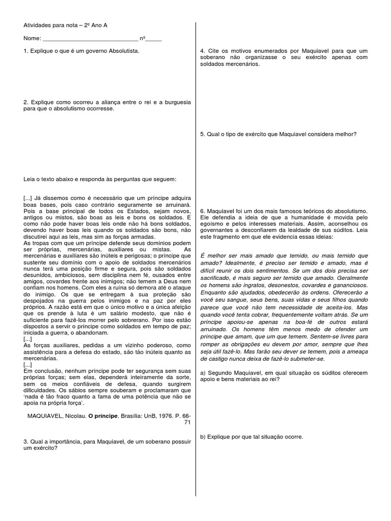 1. Explique o que é um governo Absolutista. 4. Cite os motivos enumerados por Maquiavel para que um