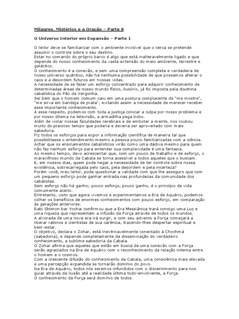 assumir o controle sobre o seu destino. Estar no comando do próprio barco é algo que está inalteravelmente ligado e que depende do nosso conhecimento da vasta extensão do meio ambiente, terrestre e galáctico. O conhecimento é a conexão, e sem uma compreensão completa e verdadeira de nosso universo quântico, não há nenhuma possibilidade de que possamos alterar o caos e a desordem futuros em nossas vidas. A necessidade de se fazer um esforço concentrado para adquirir conhecimento de determinadas áreas de nosso mundo físico, ilusório, já foi imposta pela doutrina cabalística do Pão da Vergonha. Sei bem que o homem comum caiu em uma postura complacente de "me mostre", "me sirva em bandeja de prata", evitando assim a necessidade de merecer receber esse importante conhecimento. A esse respeito, podemos com toda a justiça colocar a culpa por nosso problema e por nosso dilema na televisão, a armadilha pega bobo. Além de violar nossas faculdades cerebrais e de embotar a mente, nos roubou muito do precioso tempo que poderia e deveria ser aproveitado com mais sabedoria. Fiz todos os esforços para expor a informação científica de maneira tal que possibilitasse o entendimento mesmo a pessoa pouco familiarizadas com a ciência. Achar que os ensinamentos cabalísticos virão como uma dádiva mesmo para quem não faz nenhum esforço para entender sua complexidade é uma fantasia. Ao mesmo tempo, devo acrescentar que, com um pouco de trabalho e de esforço, o maravilhoso mundo da Cabala se torna acessível a todos aqueles que o buscam. E, em nossos dias, quem pode negar a necessidade de ter controle sobre nossa existência, sobrecarregada pelo caos, pela desordem e pela incerteza? Porém você, meu leitor, pode questionar a validade com que lhe asseguro que com um pequeno esforço pode ganhar entrada nas profundezas da comunidade dos cabalistas. Sem esforço não há ganho; pouco esforço, pouco ganho, é o princípio de vida comumente aceito. Entretanto, visto que agora vivemos e experimentamos a Era de Aquário, podemos colher os benefícios de enormes conhecimentos com pouco esforço, em comparação às gerações anteriores. Rabi Shimon bar Yochai confirmou que a Era Messiânica trará consigo uma Luz e uma riqueza que representam a infusão da Força através de todos os mundos. A alvorada de uma nova era irá surgir, e com seu advento a Força começará a liberar rabinos e cientistas de sua carência, trazendo-lhes despertar espiritual e bem-estar. O objetivo, declara o Zohar, está inextricavelmente conectado à Chochmá (sabedoria), e depende completamente da disseminação do verdadeiro conhecimento, a sublime sabedoria da Cabala. O Zohar afirma que aqueles que estão em busca de uma conexão com a Força serão agraciados na Era de Aquário com o reconhecimento da relação interna entre o homem e o cosmos. Com a crescente difusão do conhecimento da Cabala, uma consciência mais elevada e uma percepção expandida se tornarão domínio do povo. Na Era de Aquário, todos nós seremos infundidos com o discernimento para nos guiar através da ilusão até a realidade última todo-envolvente, a Força. O conhecimento da Força será domínio de todos. Dê-me uma abertura do tamanho do buraco de agulha, e Eu te abrirei os portões celestiais.