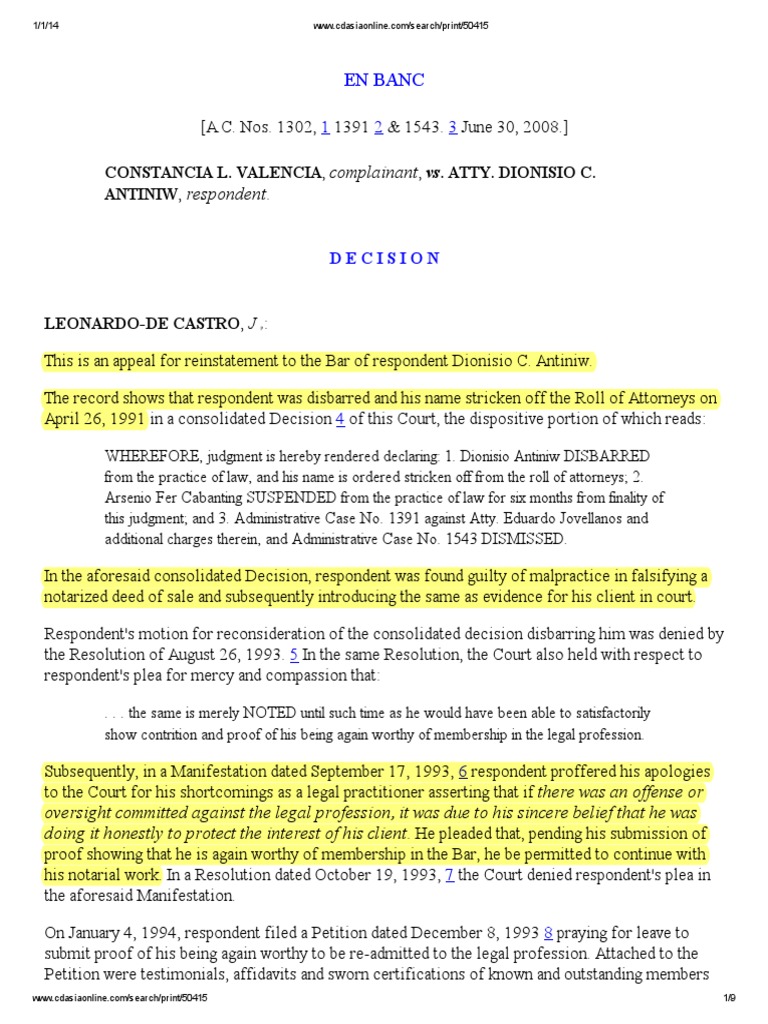 WHEREFORE, judgment is hereby rendered declaring: 1. Dionisio Antiniw DISBARRED