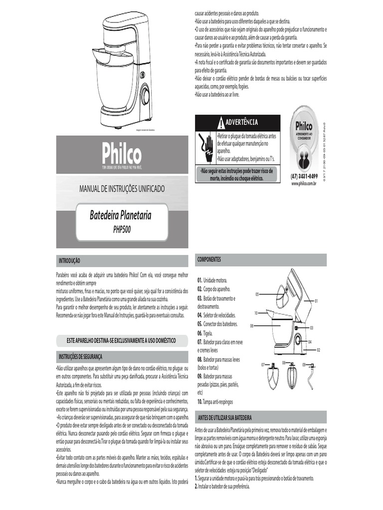 Parabéns você acaba de adquirir uma batedeira Philco! Com ela, você consegue melhor rendimento e obtém sempre misturas uniformes, nas e macias, no ponto que você quiser, seja qual for a consistência dos ingredientes. Use a Batedeira Planetária como uma grande aliada na sua cozinha. Para garantir o melhor desempenho de seu produto, ler atentamente as instruções a seguir. Recomenda-se não jogar fora este Manual de Instruções, guardá-lo para eventuais consultas.
