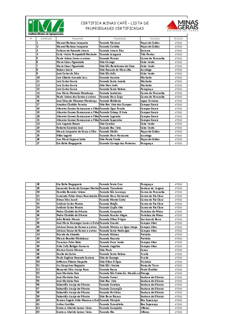 800 Sitio Posses Coqueiral ATIVO 801 Alexandre Rodrigues Alves Sitio Boa Vista Candeias ATIVO 802 Alexandre Rodrigues Alves. Sitio Melos Candeias ATIVO 803 Alexandre Rodrigues Alves. Sitio Buraqueiros Candeias ATIVO 804 Roberto Eloi Leopoldino Fazenda Água Mansa Coqueiral ATIVO 805 Vitor Reinaldo Paiva Fazenda Água Mansa Coqueiral ATIVO 806 Nelson Henrique Belineli de MirandaSítio Água Mansa Paulista Coqueiral ATIVO 807 José Reis de Resende Sítio Capão Grande São Francisco de Paula ATIVO 808 Roneido Teofilo de Carvalho Fazenda Santa Helena São Tomaz de Aquino ATIVO 809 Hélton Sena de Souza Fazenda Campo do Meio Candeias ATIVO 810 Alexandre Souza Santos Castro Cambraia Fazenda Mundo Novo São Francisco de Paula ATIVO 811 Jesus Euzébio Lopes Sítio Pedra Redonda II Araponga ATIVO 812 Dorival Goulart Mendes Sítio São Miguel Cordislândia ATIVO 813 José Antônio de Alvarenga Sítio Represa Perdões ATIVO 814 Arnando Antônio Carvalho Sítio Capão Perdões ATIVO 815 Adilson Johnny Monteiro de Alvarenga Sítio Custodinho Perdões ATIVO 816 Edivana Zaneti Dias Sítio do Café Poços de Caldas ATIVO 817 Weber Marcos Dias Sítio Leite Poços de Caldas ATIVO 818 Assis Reis da Silva Sítio São Bartolomeu de Cima Cabo Verde ATIVO 819 Helio Silva Pires Sítio Companhia Lajinha ATIVO 820 Marcos Cesar Santomauro Fazenda Mundo Novo Bom Sucesso ATIVO 821 Fazenda Rio Doce Ltda Fazenda Rio Doce Santa Luzia Caratinga ATIVO 822 José Wagner Ribeiro Junqueira Fazenda Serra das Três Barras Carmo de Minas ATIVO 823 Maria Inês Vilela Rezende e Outros Sítio Santa Inês e Monte Verde Cordislandia ATIVO 824 Tarcisio Soares Pereira Sítio Limeira Cristina ATIVO 825 Edson Arantes de Oliveira Neto Sítio Catalão Santa Margarida ATIVO 826 Valdiva de Oliveira Sítio Catalão Santa Margarida ATIVO 827 Almir Aparecido Gonçalves Sítio Córrego do Ouro Conceição das Pedras ATIVO 828 Luiz Carlos Gonçalves Sítio São Luiz Conceição das Pedras ATIVO 829 Glicia Pereira Resende Silva Fazenda Oriente Bom Sucesso ATIVO 830 José Umbelino Machado Sítio Represa Perdões ATIVO 831 Guilherme Lopes Pereira Júnior Sítio Santa Barbara Eloi Mendes ATIVO 832 Benedito Edmilson Ferraz Sítio Romão São João da Mata ATIVO 833 João Pedro Lopes Sítio Rainha da Paz Divisa Nova ATIVO 834 José Lopes Terra Junior Fazenda Bela Vista Alterosa ATIVO 835 José Lopes Terra Junior Sítio Bela Vista Alterosa ATIVO 836 João Victor de Oliveira Godoy Fazenda Pontinha Fama ATIVO 837 Maria do Carmo de Jesus Sítio Seis Maria Campo do Meio ATIVO 838 Luiz Antônio Citton Sítio Cala Boca Guaxupé ATIVO 839 Marcos Rogério Zamarco Sítio Nossa Senhora Aparecida Monte Santo de Minas ATIVO 840 José Tertuliano Duarte Sítio Maria Ferreira ou Cachoeirinha Monte Santo de Minas ATIVO 841 Pedro Romão de Abreu Sítio Catalão Santa Margarida ATIVO 842 Jacinto Machado de Souza Sítio Sucanga Canaa ATIVO 843 Sebastião Assis Lopes Sítio Cancan Canaa ATIVO 844 José Márcio Dias Paes Sítio Boa Vista Ervalia ATIVO 845 Marcelo Cunha Dias Paes e Natália Silva SítioFontes Vista Alegre Ervalia ATIVO 846 Adélio Luiz Caetano Sítio Reserva Ervalia ATIVO 847 Adélio Luiz Caetano Sítio Boa Vista Ervalia ATIVO 848 Élcio José de Souza Sítio Boa Vista Ervalia ATIVO 849 Antônio Pádua de Carvalho Fazenda Santa Paula Jacui ATIVO 850 Heli Ronaldo Del Vale Gaspar Sítio Recanto Verde Muzambinho ATIVO 851 Heli Ronaldo Del Vale Gaspar Sítio São João Muzambinho ATIVO 852 José Geraldo de Castro Sítio Catalão Santa Margarida ATIVO 853 Fernando Barbosa da Silva Sítio Fazenda Velha São Pedro da União ATIVO 854 Vitor Aprigio da Silva Sítio Santo Antônio Divisa Nova ATIVO 855 Kleber Adriano de lima / Cleiton André Sítios de N.S. LimaAparecida Pedralva ATIVO 856 Kleber Adriano de lima / Cleiton André Barra de Mansa Lima Pedralva ATIVO 857 Kleber Adriano de lima / Cleiton André Santo de Lima Inácio Pedralva ATIVO 858 Luciene Aparecida dos Santos Mota eSítio outro Alecrin Pedralva ATIVO 859 Daniel José da Costa Evangelista Companhia 2A Lajinha ATIVO 860 Tiago Antônio da Costa Evangelista Companhia 2C Lajinha ATIVO 861 Helio Silva Pires São Sebastião Lajinha ATIVO 862 Gilberto Romeiro de Abreu Sítio Catalão ou Sítio Boa Vista Santa Margarida ATIVO 863 Manoel Gonçalves de Oliveira Sítio Catalão Santa Margarida ATIVO 864 Eli da silva Sítio Dias Camacho ATIVO 865 Hélio Castro Coelho Fazenda da Laje Machado ATIVO 866 José Rodrigues Lopes Sítio Irmãos Rodrigues Caratinga ATIVO 867 Vanildo Antônio de Araújo Sítio São João Muzambinho ATIVO 868 Manoel dos Reis P.A São Pedro Patrocínio ATIVO 869 Paulo Cesar Teixeira Criciuma Santa Rita de Minas ATIVO 870 Paulo Cesar Teixeira Jequitibá Santa Rita de Minas ATIVO 871 Paulo Cesar Teixeira Barrinha Piedade de Caratinga ATIVO 872 Dário Avelino de Abreu Sítio Catalão Santa Margarida ATIVO 873 Emílio Policarpo de Castro Sítio Catalão Santa Margarida ATIVO 874 João Aurimar de Oliveira Sítio Catalão Santa Margarida ATIVO 875 José Domingos de Oliveira Sítio Catalão Santa Margarida ATIVO 876 Wagner Lopes Sítio Pedra Redonda Araponga ATIVO 877 Alexsandro Guimarães Aniceto Sítio Pedra Redonda Araponga ATIVO 878 Clauvinei José Aniceto Sítio Pedra Redonda Araponga ATIVO 879 Jonas Evangelista Lopes Sítio Pedra Redonda Araponga ATIVO 880 Natanael Elias Lopes Sítio Pedra Redonda Araponga ATIVO 881 Samuel Inácio Lopes Sítio Pedra Redonda I Araponga ATIVO 882 Samuel Inácio Lopes Sítio Pedra Redonda II Araponga ATIVO 883 Ednilson de Paula e Silva Fazenda Santa Barbara Cabo Verde ATIVO 884 Henrique Penido Rosa Fazenda Gameleira Vargem Bonita ATIVO 885 Marco Antônio Venteu Fazenda Califórnia Vargem Bonita ATIVO 886 José Maurício Raimundo Sítio do Retiro/ Sítio Dois Irmãos Conceição das Pedras ATIVO 887 Antonio José Vilas Boas Sítio Dois Irmãos Conceição das Pedras ATIVO 888 Antonio Marcos de Carvalho Sítio Corrego do Gordura Fama ATIVO 889 Claudio Antônio Mar
