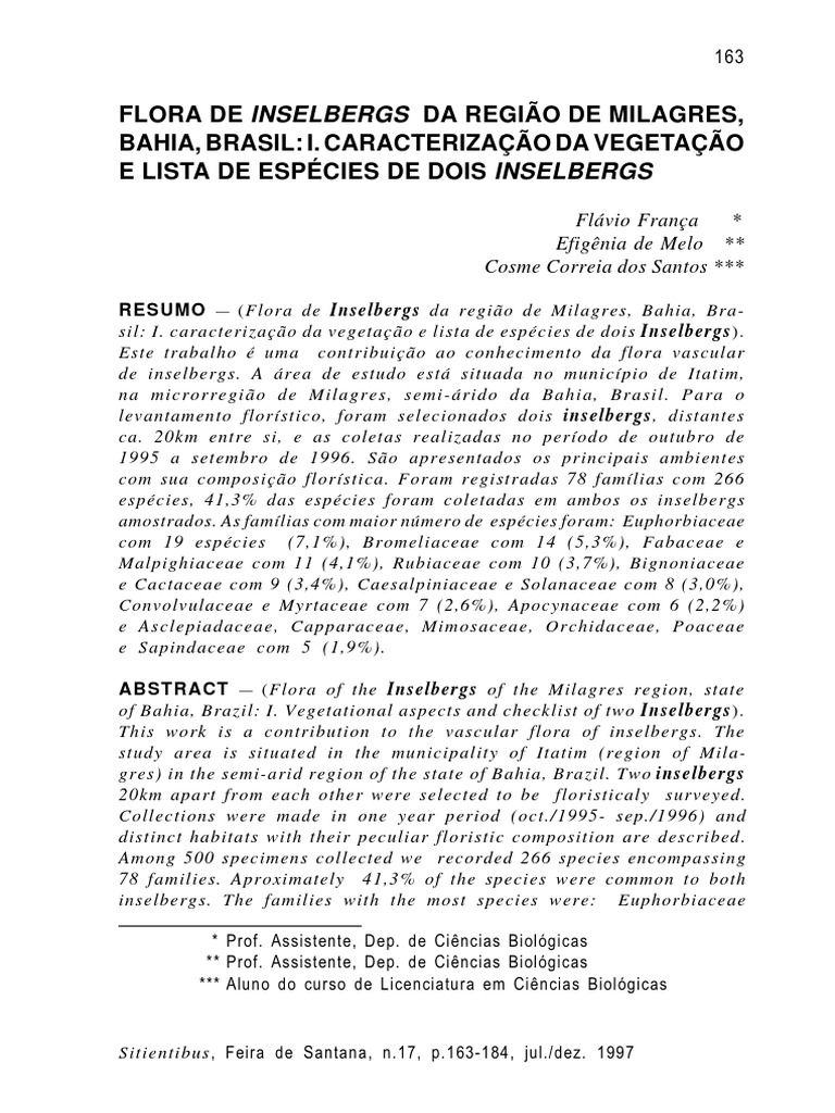ABSTRACT — (Flora of the Inselbergs of the Milagres region, state of Bahia, Brazil: I. Vegetational aspects and checklist of two Inselbergs). This work is a contribution to the vascular flora of inselbergs. The study area is situated in the municipality of Itatim (region of Mila- gres) in the semi-arid region of the state of Bahia, Brazil. Two inselbergs 20km apart from each other were selected to be floristicaly surveyed. Collections were made in one year period (oct./1995- sep./1996) and distinct habitats with their peculiar floristic composition are described. Among 500 specimens collected we recorded 266 species encompassing 78 families. Aproximately 41,3% of the species were common to both inselbergs. The families with the most species were: Euphorbiaceae