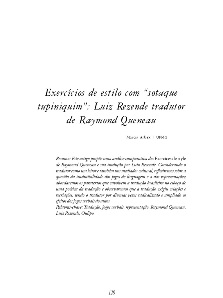 Abstract: This article proposes a comparative analysis of the Exercices de Style de Raymond Queneau and its translation by Luiz Rezende. Considering the translator as a reader and cultural mediator, we will focus on the translatability of language games and representations, discuss the paratexts which involves Brazilian version in a poetics of the translation, and observe that this translation demanded creations and recreations, having the translator for several times radicalized and expanded the effects of verbal games of the author. K eywords: Translation, Verbal Games, Representation, R aymond Queneau, Luiz Rezende.