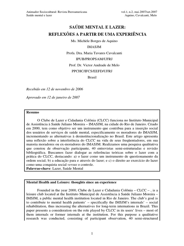 Saúde mental e lazer Aquino, Cavalcanti, Melo