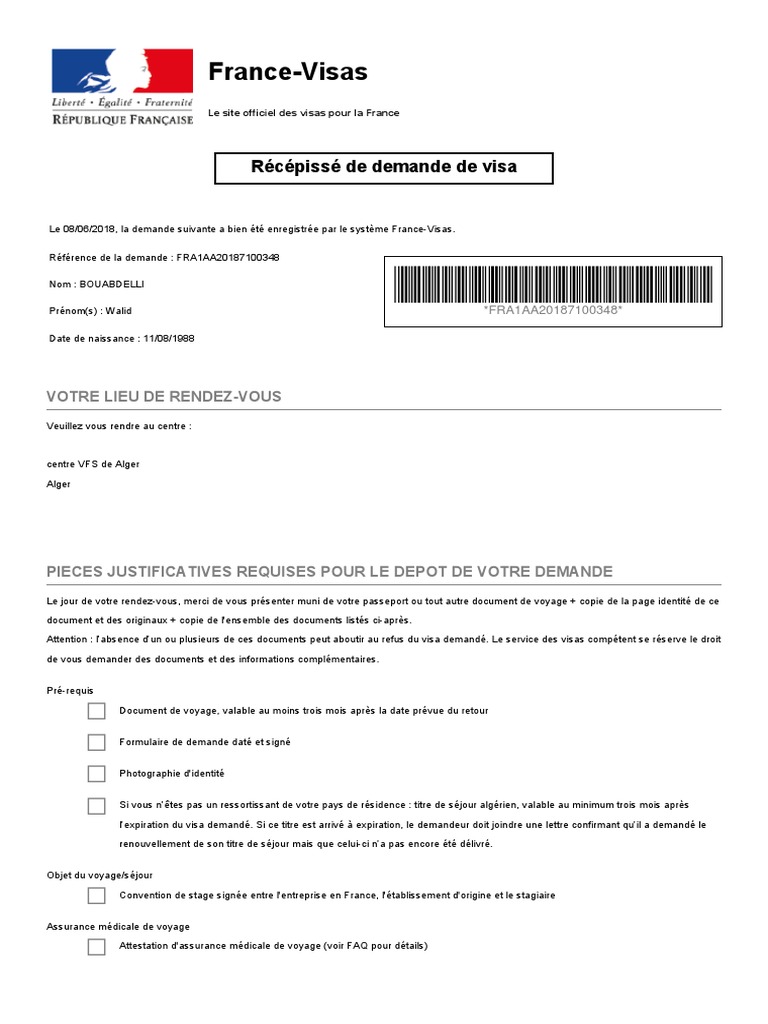 Le 08/06/2018, la demande suivante a bien été enregistrée par le système France-Visas.