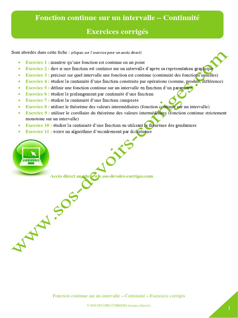 Fonction continue sur un intervalle – Continuité – Exercices corrigés