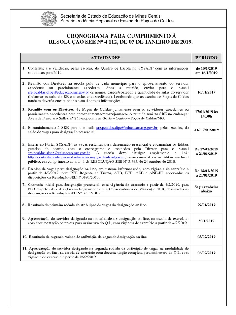 sre.pcaldas.dipe@educacao.mg.gov.br os nomes, cargos/conteúdo e quantidade de aulas do servidor 16/01/2019
