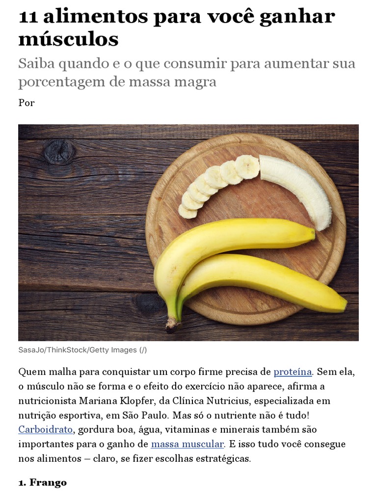 o músculo não se forma e o efeito do exercício não aparece , afirma a nutricionista Mariana Klopfer, da Clínica Nutricius, especializada em nutrição esportiva, em São Paulo. Mas só o nutriente não é tudo! Carboidrato, gordura boa, água, vitaminas e minerais também são importantes para o ganho de massa muscular. E isso tudo você consegue nos alimentos – claro, se fizer escolhas estratégicas.