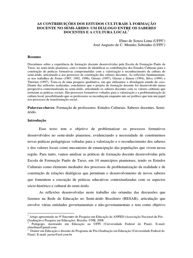 Palavras-chaves: Formação de professores. Estudos Culturais. Saberes docentes. Semi- árido.