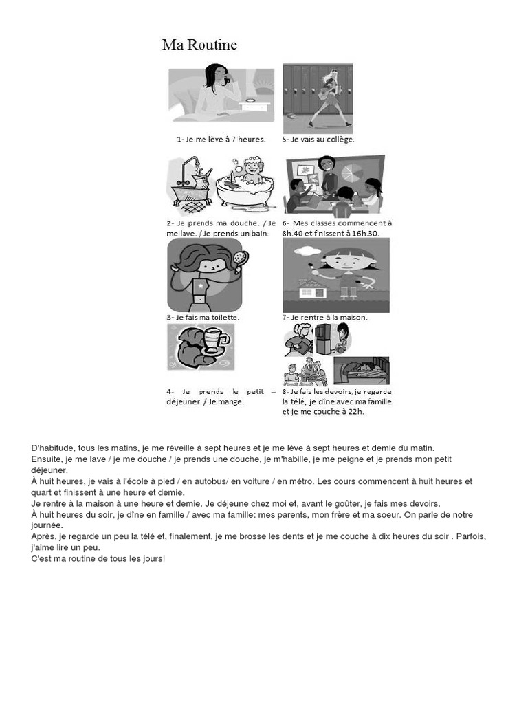 À huit heures, je vais à l'école à pied / en autobus/ en voiture / en métro. Les cours commencent à huit heures et