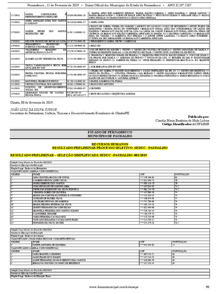 Pernambuco , 11 de Fevereiro de 2019 • Diário Oficial dos Municípios do Estado de Pernambuco • ANO X | Nº 2267