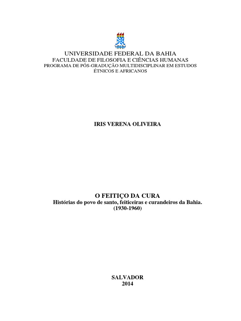 Oliveira, Iris Verena . O feitiço da cura: histórias do povo de santo, feiticeiras e curandeiros da Bahia (1930-1960) / por Iris Verena Oliveira. – 2014. 297 f. : il.