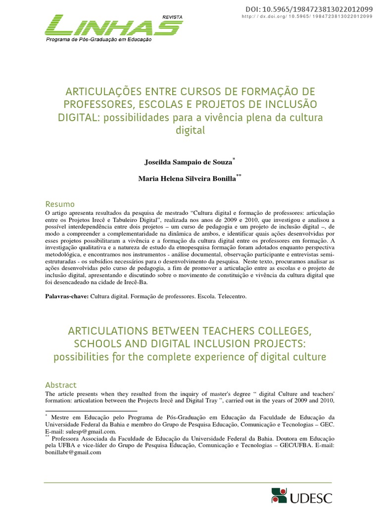O artigo apresenta resultados da pesquisa de mestrado “Cultura digital e formação de professores: articulação