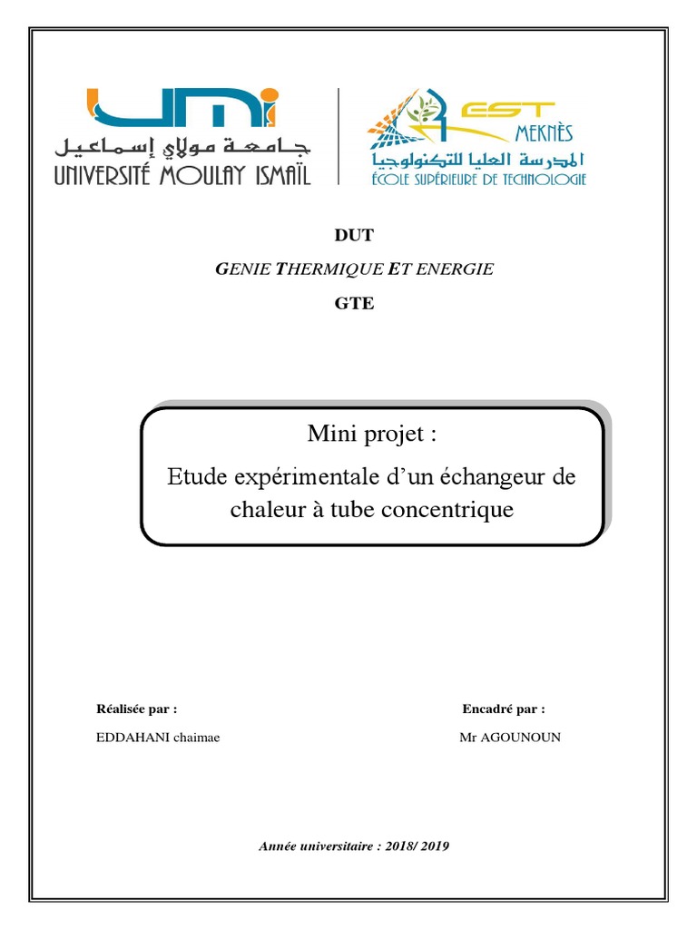 Ce travail est pour objectif de l’exploitation d’un échangeur de chaleur à tube concentrique