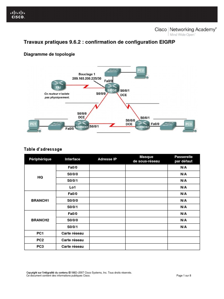 Protocoles et concepts de routage : protocole EIGRP Travaux pratiques 9.6.2 : confirmation de configuration EIGRP