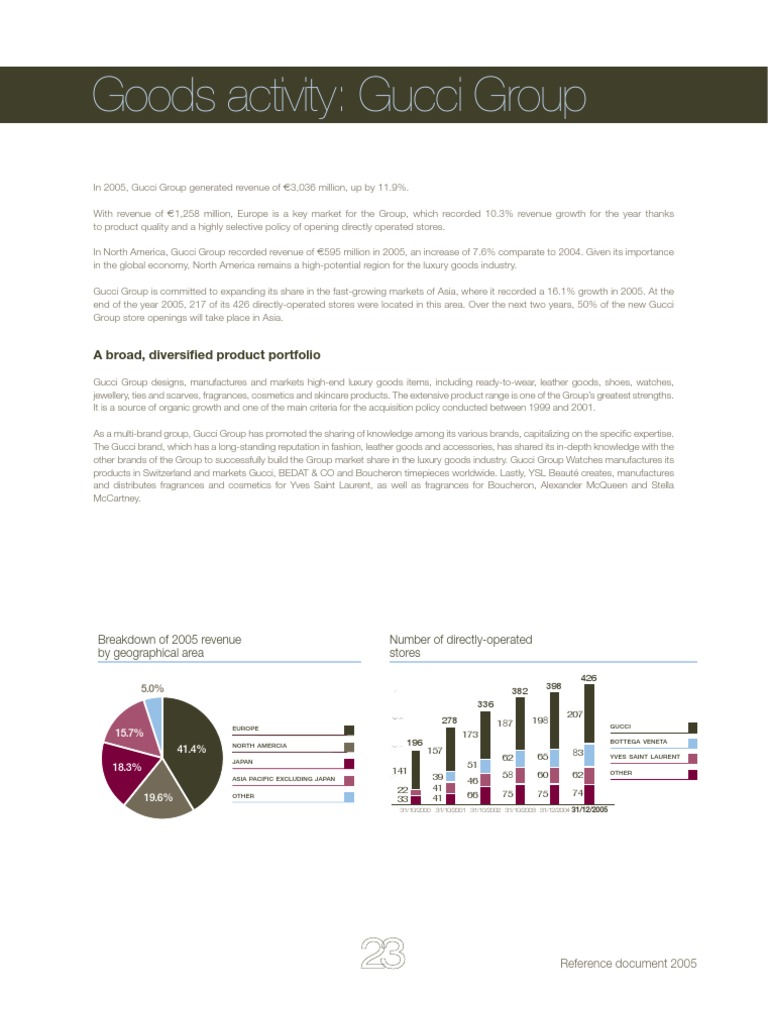 In 2005, Gucci Group posted revenue of €3,036 million, an increase of 11.9%, representing 17.1% of the PPR Group’s revenue. It also gene-
