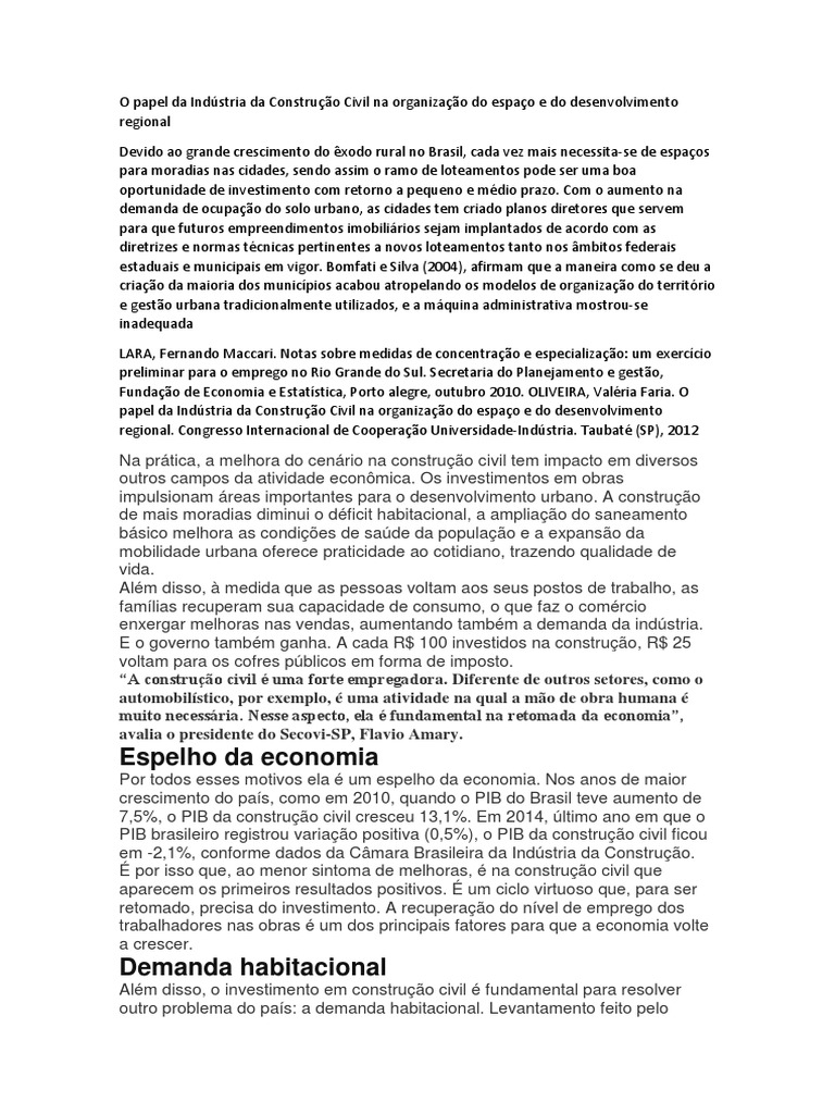 papel da Indústria da Construção Civil na organização do espaço e do desenvolvimento