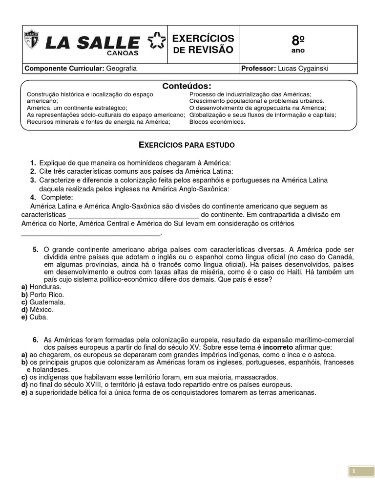 Construção histórica e localização do espaço americano; América: um continente estratégico; As representações sócio-culturais do espaço americano; Recursos minerais e fontes de energia na América;