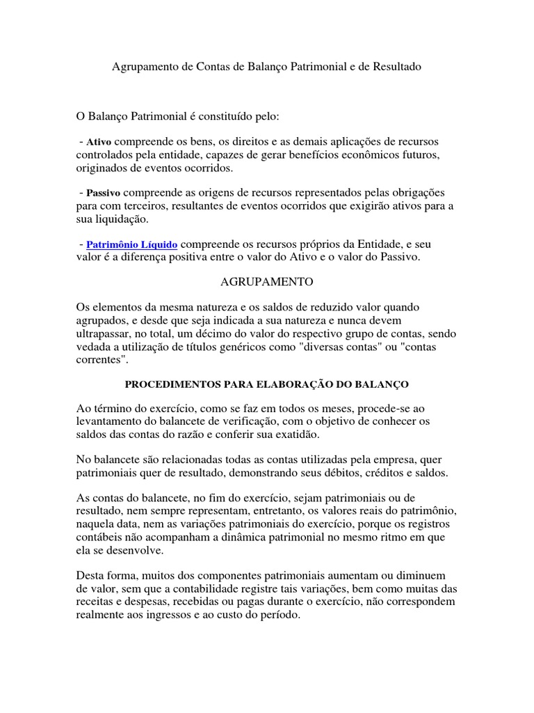 Agrupamento de Contas de Balanço Patrimonial e de Resultado