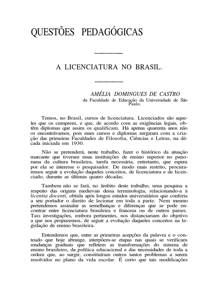 Não se pretenderá, neste trabalho, fazer o histórico da atuação marcante que tiveram essas instituições de ensino superior no pano- rama da cultura brasileira, tarefa necessária, entretanto, que espera por ela se interesse o pesquisador. De modo mais restrito, procura- remos seguir a evolução daqueles conceitos, de licenciatura e de licen- ciado, durante as últimas quatro décadas.