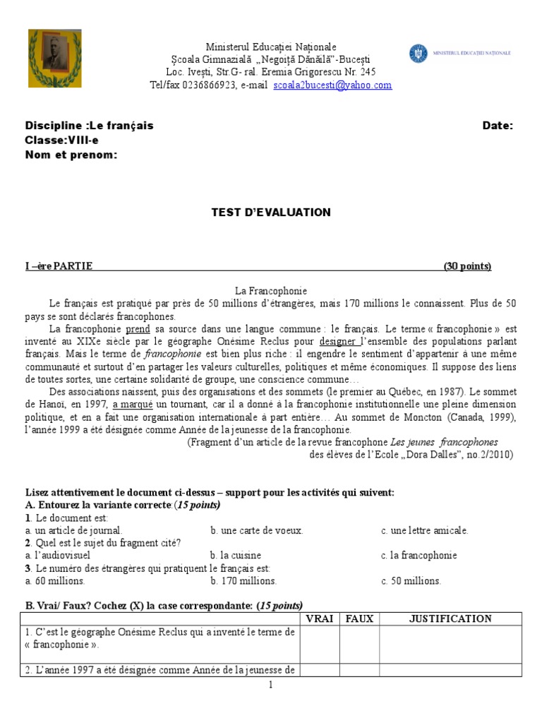 B. Vrai/ Faux? Cochez (X) la case correspondante: (15 points)