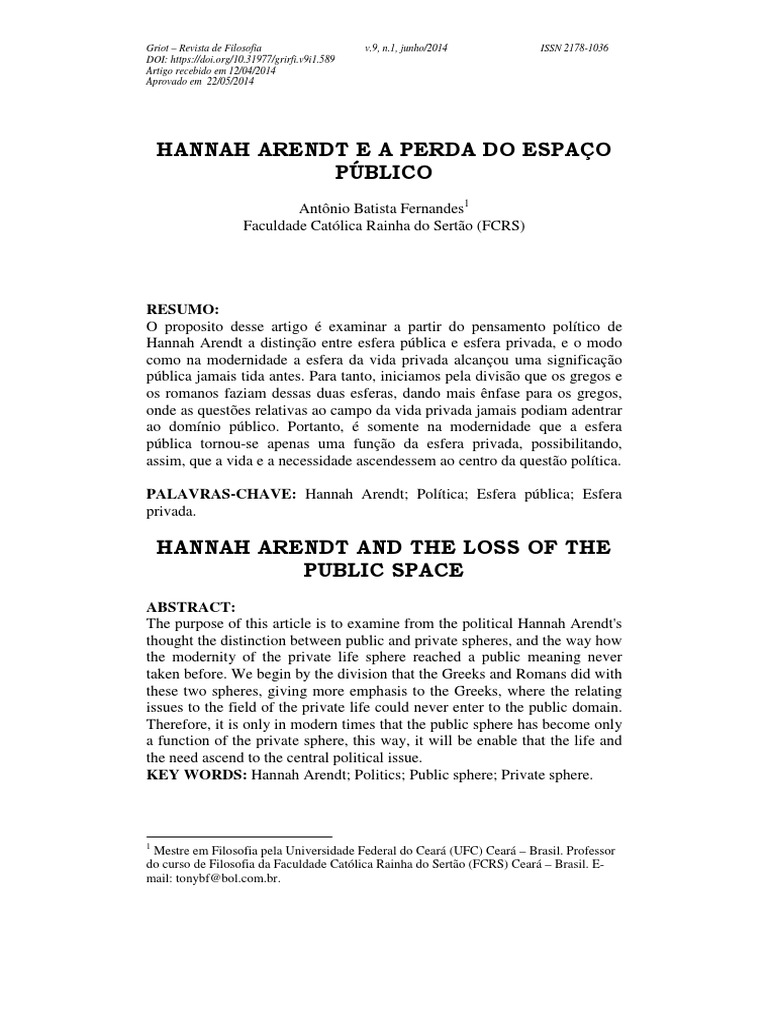Hannah Arendt a distinção entre esfera pública e esfera privada, e o modo
