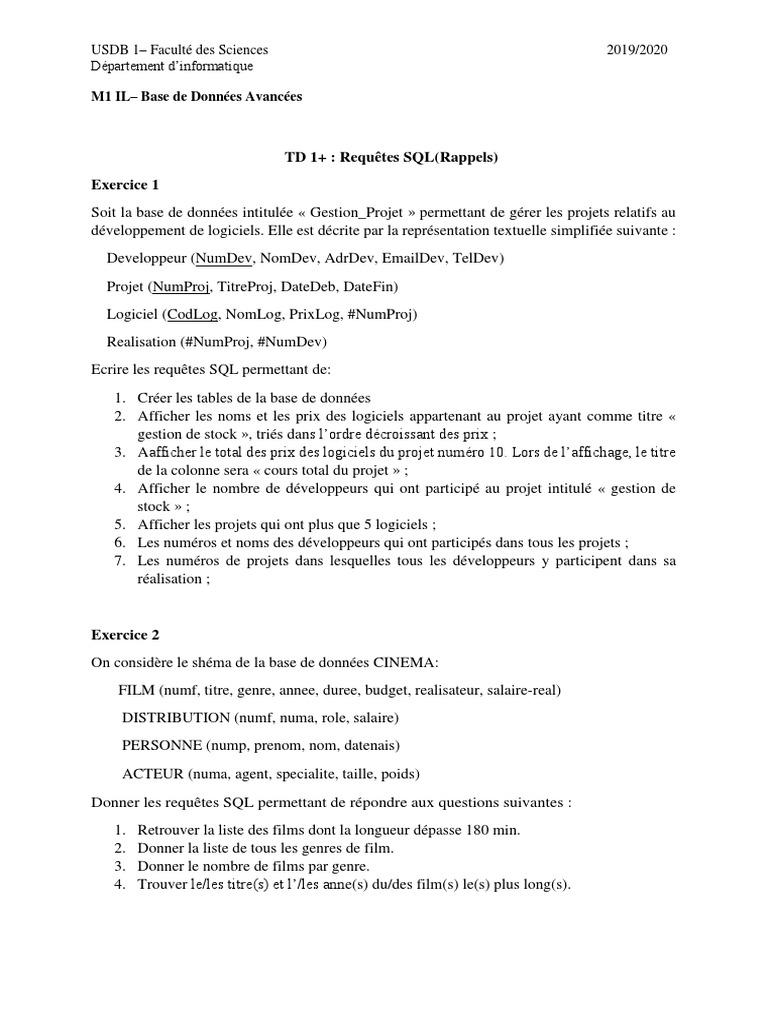 Soit la base de données intitulée « Gestion_Projet » permettant de gérer les projets relatifs au