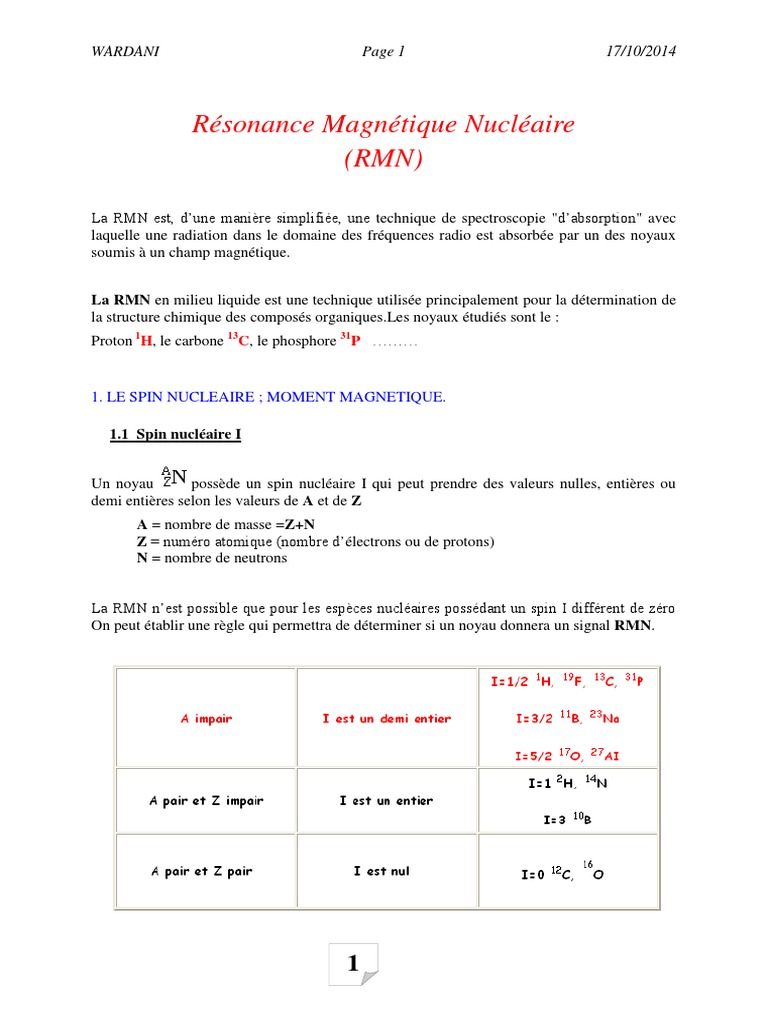 1. LE SPIN NUCLEAIRE ; MOMENT MAGNETIQUE.